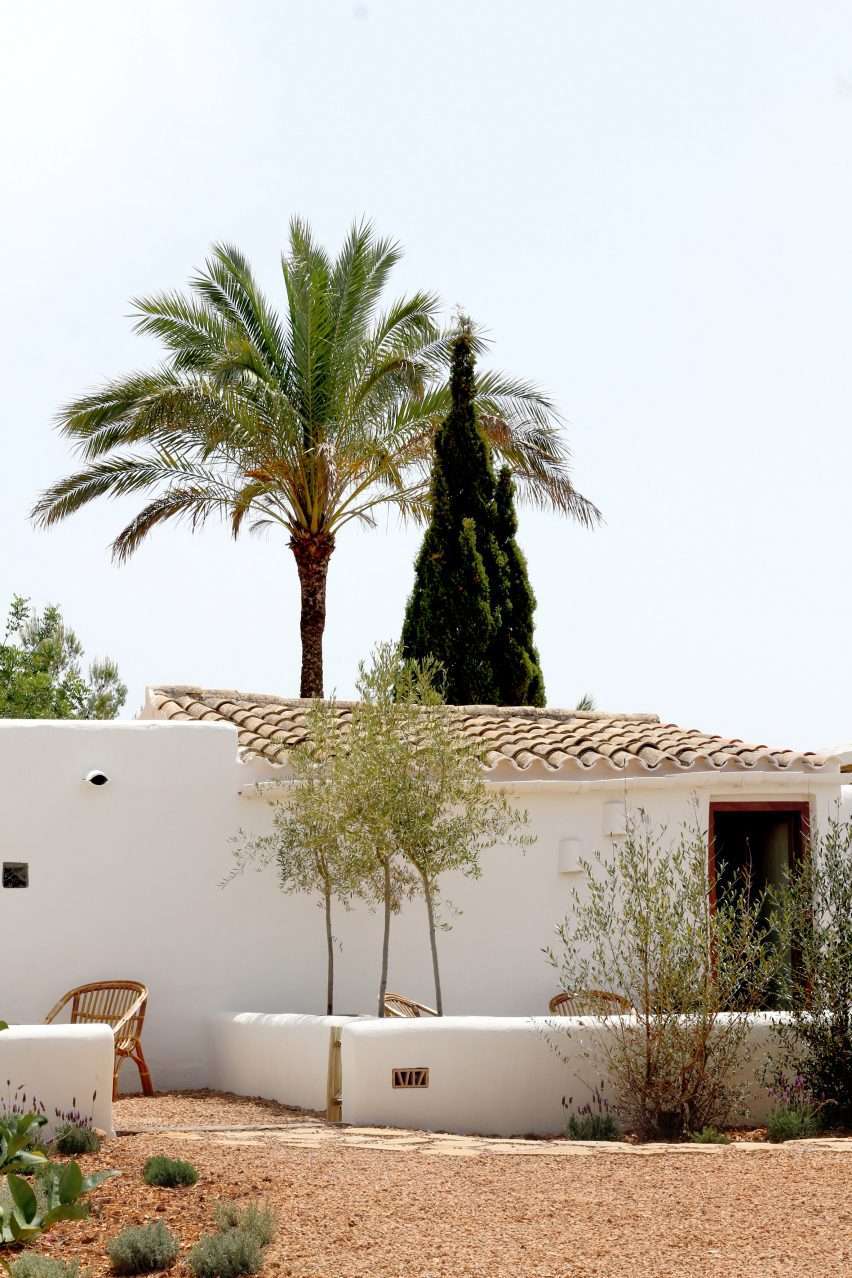 Tucked away in the mountains of Ibiza, a 19th-century farmhouse transformed into the Aguamadera resort, a secluded hideaway home designed to promote nature, wellness and food. Created by Pacha Group co-founder Iria Urgell alongside hospitality entrepreneur Pablo Fernández-Valdés, the project was under the creative direction of Carlota Sarda Caralps. Cala Llonga’s beach resort is located nearby, close to the site of the 1888 finca and its outbuildings, which now contain seven guest rooms and four suites. Also, The 27 acres of land surrounding the building have pine forests, olive groves and terraced agricultural land – a key source of the produce used by the hotel’s restaurant. The name Aguamadera derives from the Spanish terms for water and wood. Additionally, this concept is mirrored in the interior decoration and furnishings. Aguamadera Ibiza hotel