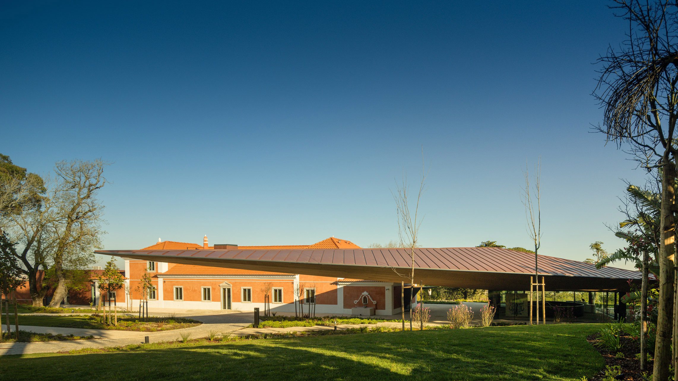 The design logic of the Albuquerque gallery is deeply rooted in topography and heritage. By excavating into the slope, the main gallery pavilion becomes both hidden and revealed in a way that preserves the quinta’s character. The cantilevered roof sheathed in timber and supported by steel arcs protects the galleries below, creates self-shading, and resonates with the traditional architecture of sloped Portuguese estates.