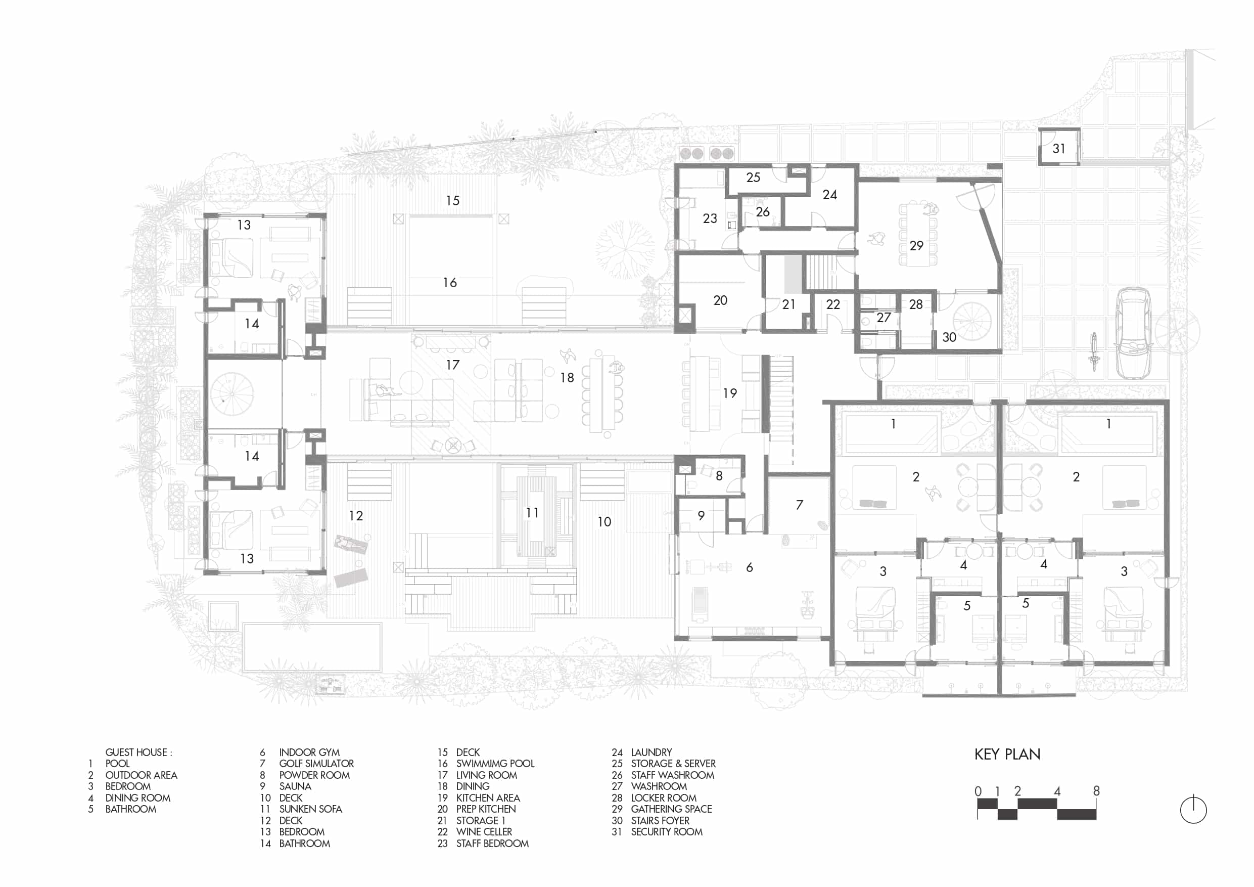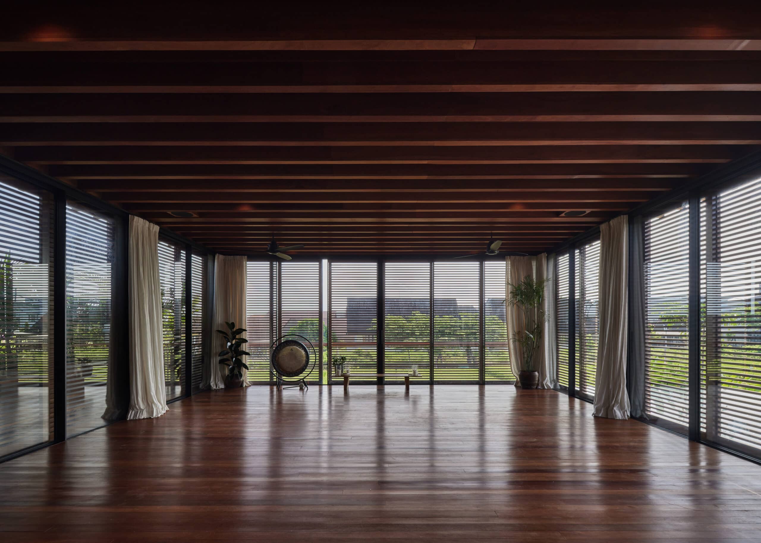 The tropical garden, designed by Bali Landscape Company, is integral to the home’s design, creating a lush backdrop that enhances the indoor-outdoor living experience. The ground floor houses a gym and two guest rooms, all designed to maximize views and access to the garden. The yoga area, inspired by Rumah Kaca Kengo Kuma, features extensive use of glass to maintain a connection with the natural surroundings.