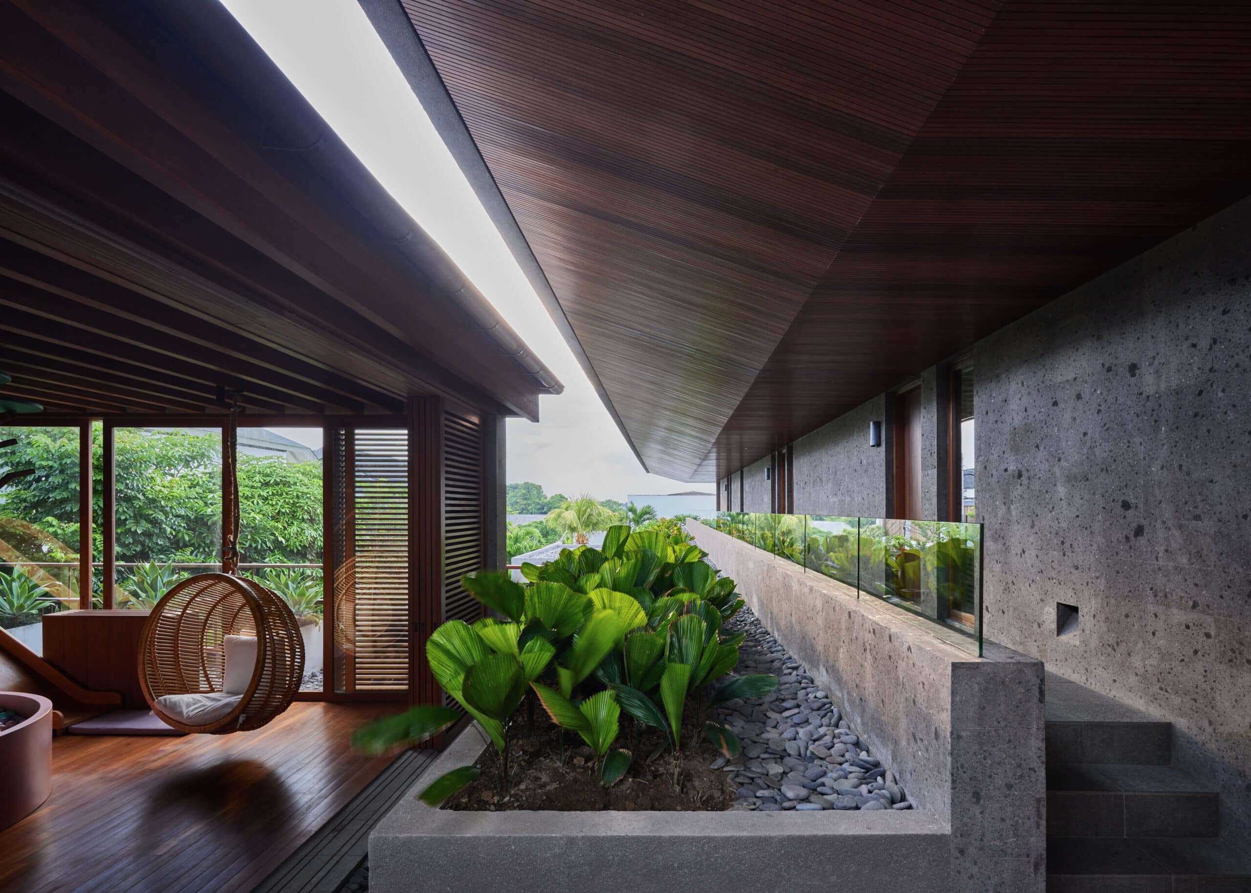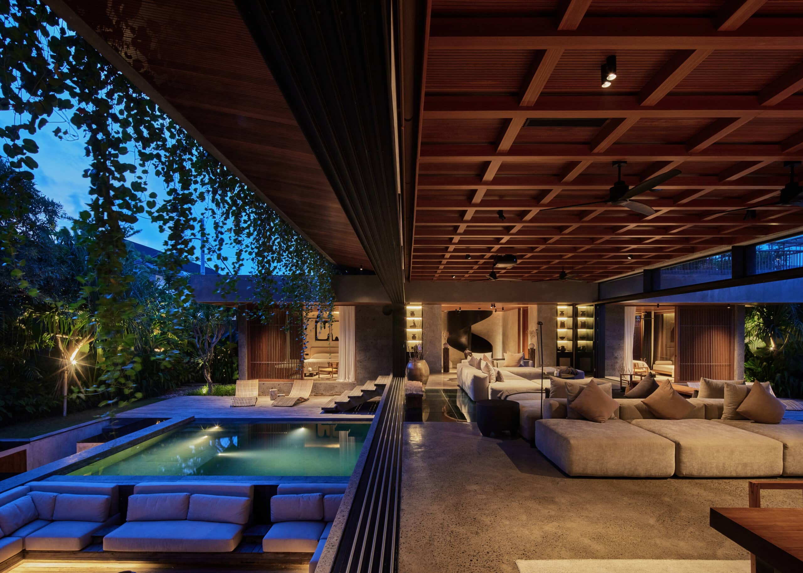 Materials throughout the residence showcase local craftsmanship, featuring paras kerobokan stone walls and wooden ceilings with fluted patterns, paired with a variety of textiles and fabrics that add depth and warmth to the clean architectural lines.
