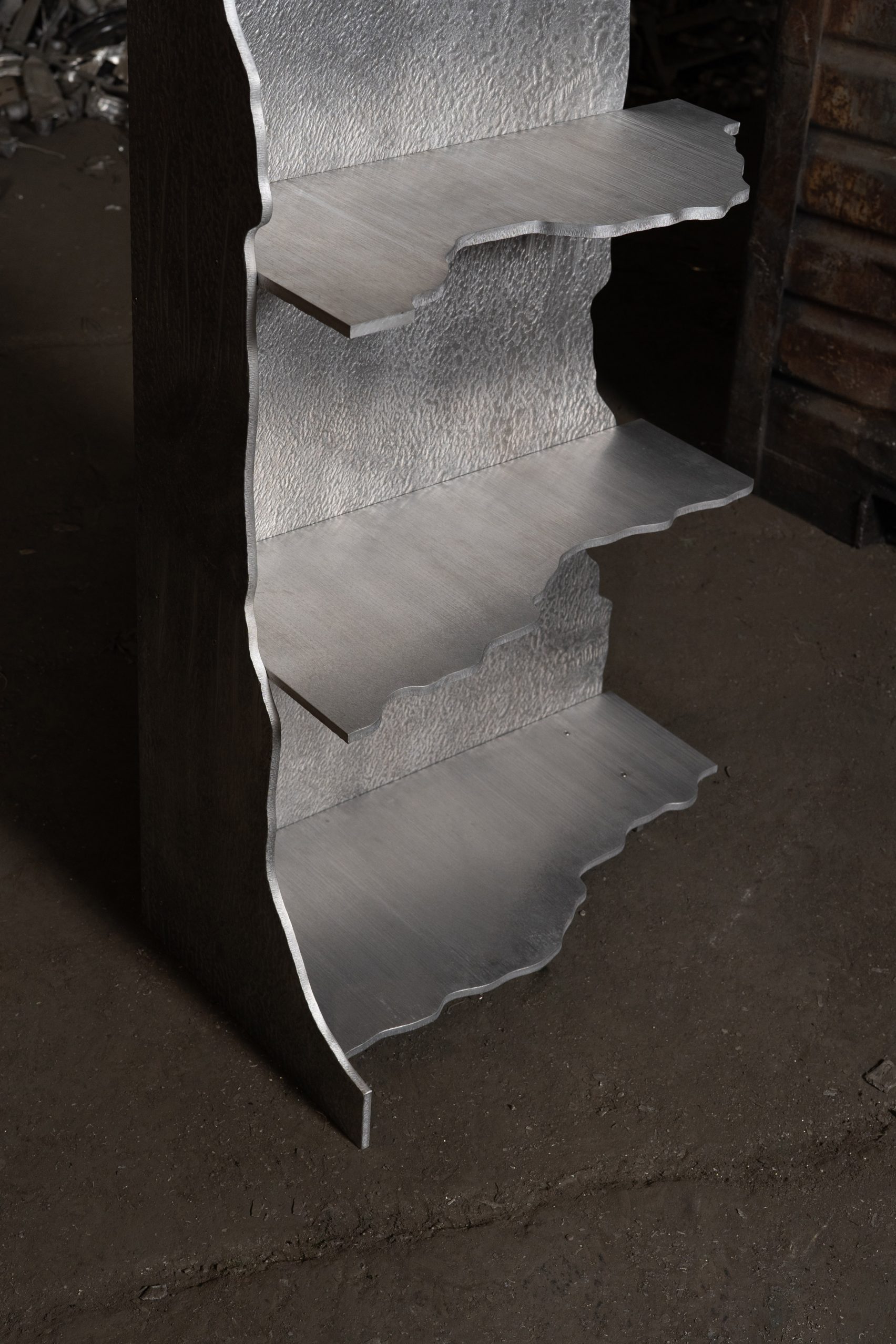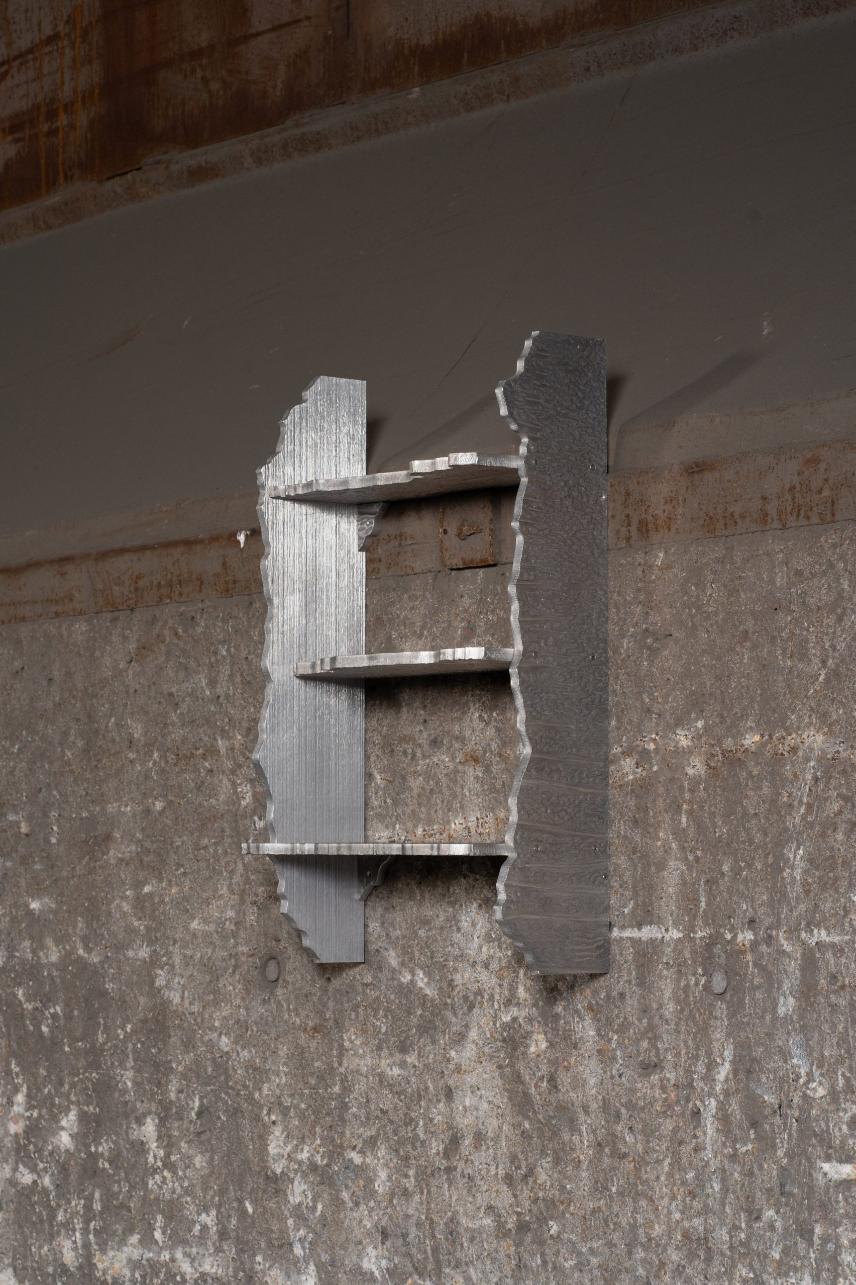 The One Side Sawn collection comprises a diverse range of items, including flat-pack tables, shelves, cabinets, mirrors, and desk accessories. What makes these pieces truly unique is their origin: they are all cut from a single sheet of aluminium crust. Additionally, a leftover material from the early stages of aluminium furniture production.
