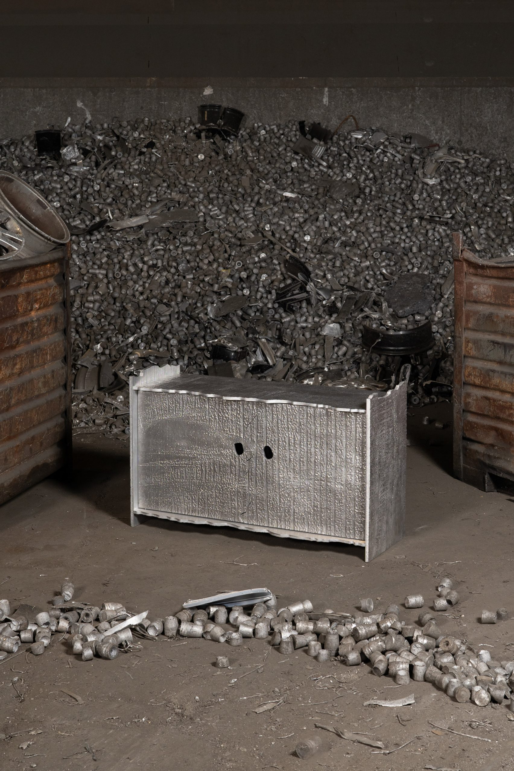 Rather than concealing the saw marks and uneven surface texture of the aluminium scrap, Studio ThusThat chose to celebrate these imperfections as integral elements of the design. The resulting furniture pieces retain the raw, industrial aesthetic of the material, showcasing its molten origins and rough-hewn appearance.