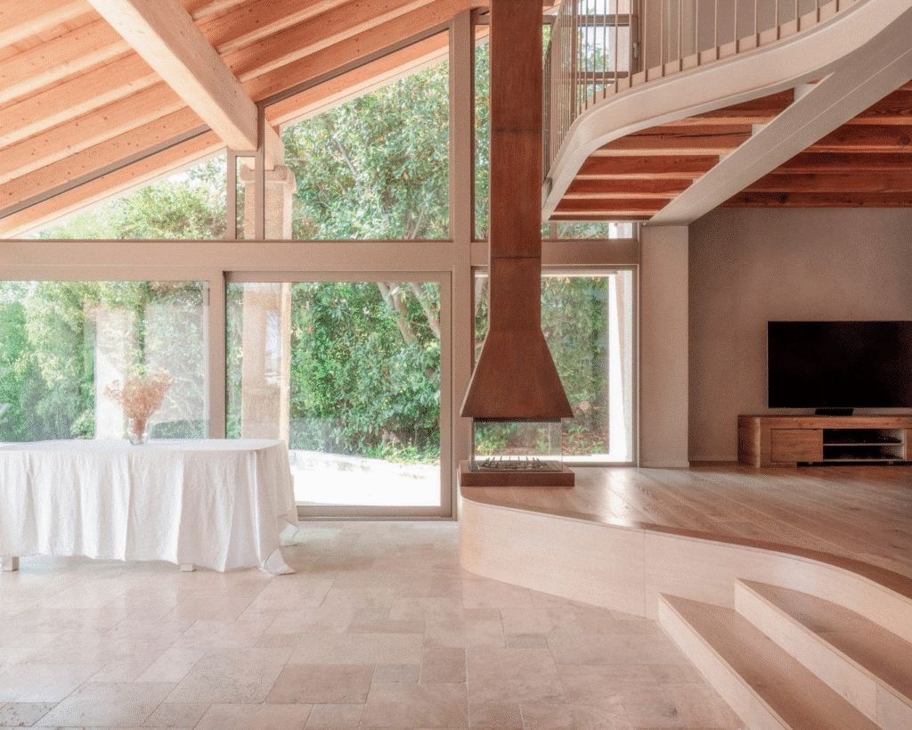 امتداد البورتيكو الزجاجيمناطق الطعام والمعيشةيسمح بدخول الضوء والرؤية ويربط الداخل بالحديقة