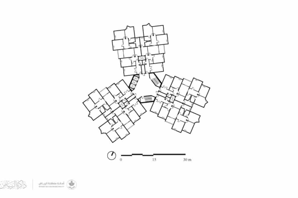 لم تنتج أزمة الإسكان في المملكة العربية السعودية بعد عام 1975 عمارة بالمعنى الحقيقي. بل أنتجت منطق شراء وتوريد. أدى النمو السكاني السريع مع السيطرة الوزارية المركزية والجداول الزمنية المضغوطة إلى مسار قرار واحد: أقصى عدد من الوحدات وأدنى تنوع في التصميم وأنظمة إنشائية قابلة للتكرار. لم يكن المخطط ثلاثي الأذرع حول النواة المركزية خيارًا تصميميًا. بل كان المخرج الحتمي لمتطلبات كود المصاعد واشتراطات مخارج الطوارئ وتحسين سرعة البناء مجتمعة في قالب إنشائي واحد. تكشف نسبة المواقف ذات الطابقين لكل أربع عمارات عن اعتماد مسبق على السيارة مدمج في سياسة التخطيط قبل وجود أي مخطط موقع. تظهر المساحات العامة المركزية والمسجد ليس كتصميم مجتمعي بل كاستيفاء تنظيمي ضمن نموذج تسليم قائم على قوائم المتطلبات. عبر منطقة الخليج خلال تلك الحقبة أنتجت ضغوط متطابقة نتائج متطابقة تقريبًا بغض النظر عن السياق. هذا المشروع هو النتيجة المنطقية لمشتريات مدفوعة بالأزمات وهندسة الحد الأدنى من الكود وطفرة اقتصادية كافأت السرعة على حساب الاستدامة العمرانية.
