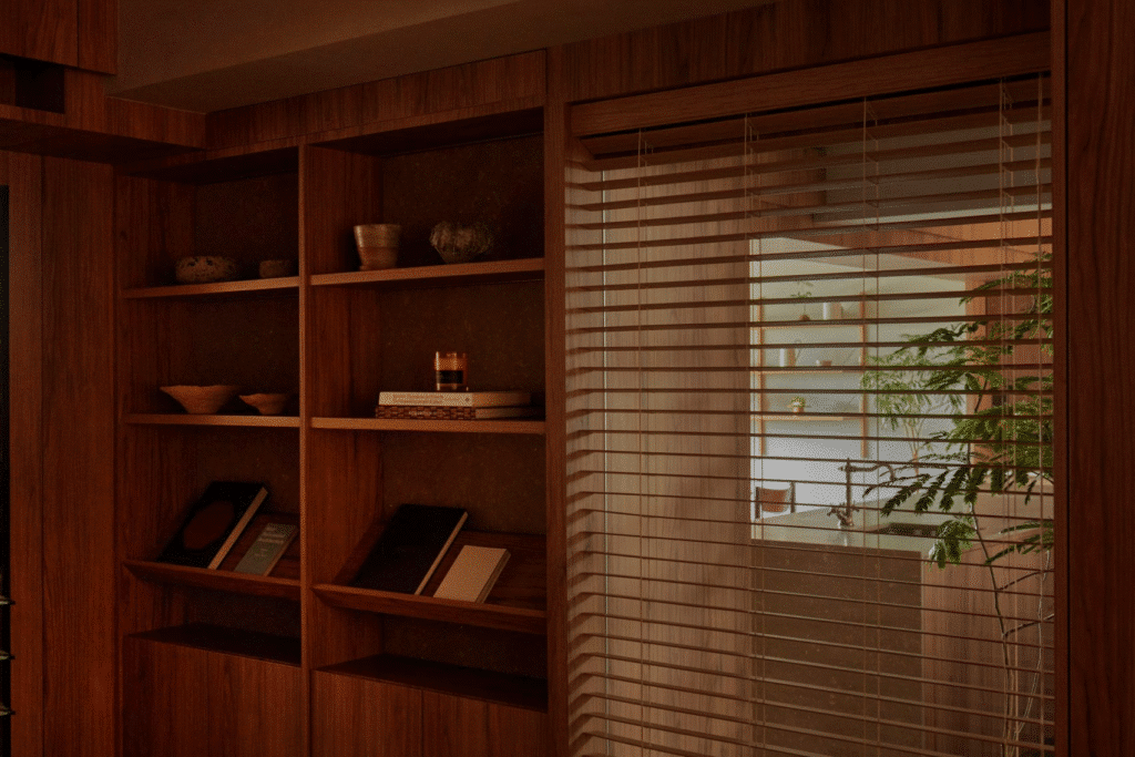 لدعم النباتات وصحة البيئة الداخلية بشكل أفضل تم استبدال الجدران الصلبة في غرف النوم بفتحات زجاجية ذات نوافذ شفرية تسمح بمرور الضوء والهواء عبر الشقة بالكامل. يضمن هذا التعديل أن النباتات الموضوعة في مختلف أنحاء المنزل تحصل على الضوء الطبيعي بشكل مستمر مع الحفاظ على الخصوصية. كما تعزز التهوية المحسّنة والسطوع العام من راحة الساكنين وكفاءة الطاقة.