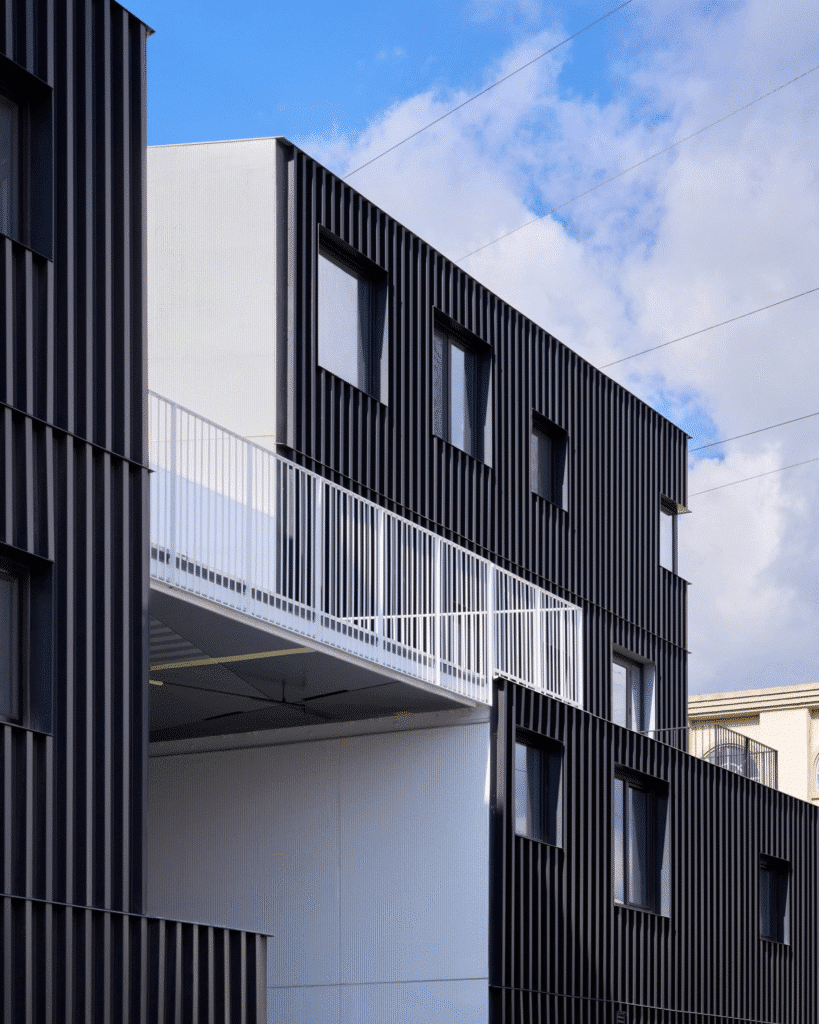 واجهات المبنى مغطاة بألواح ألومنيوم بلون الفحم وطبقة من الجص المسطح. الممرات والسلالم الخارجية تربط الأحجام المختلفة وتسمح بدخول ضوء الشمس، مما يخلق انتقالات متعددة الطبقات بين المساحات المشتركة والخاصة. تصميم LOHA يضمن أن المشروع يعمل بكفاءة، يدعم التفاعل الاجتماعي، ويقدم نموذجاً لمشاريع العيش المشترك المستقبلية في السياقات الحضرية.