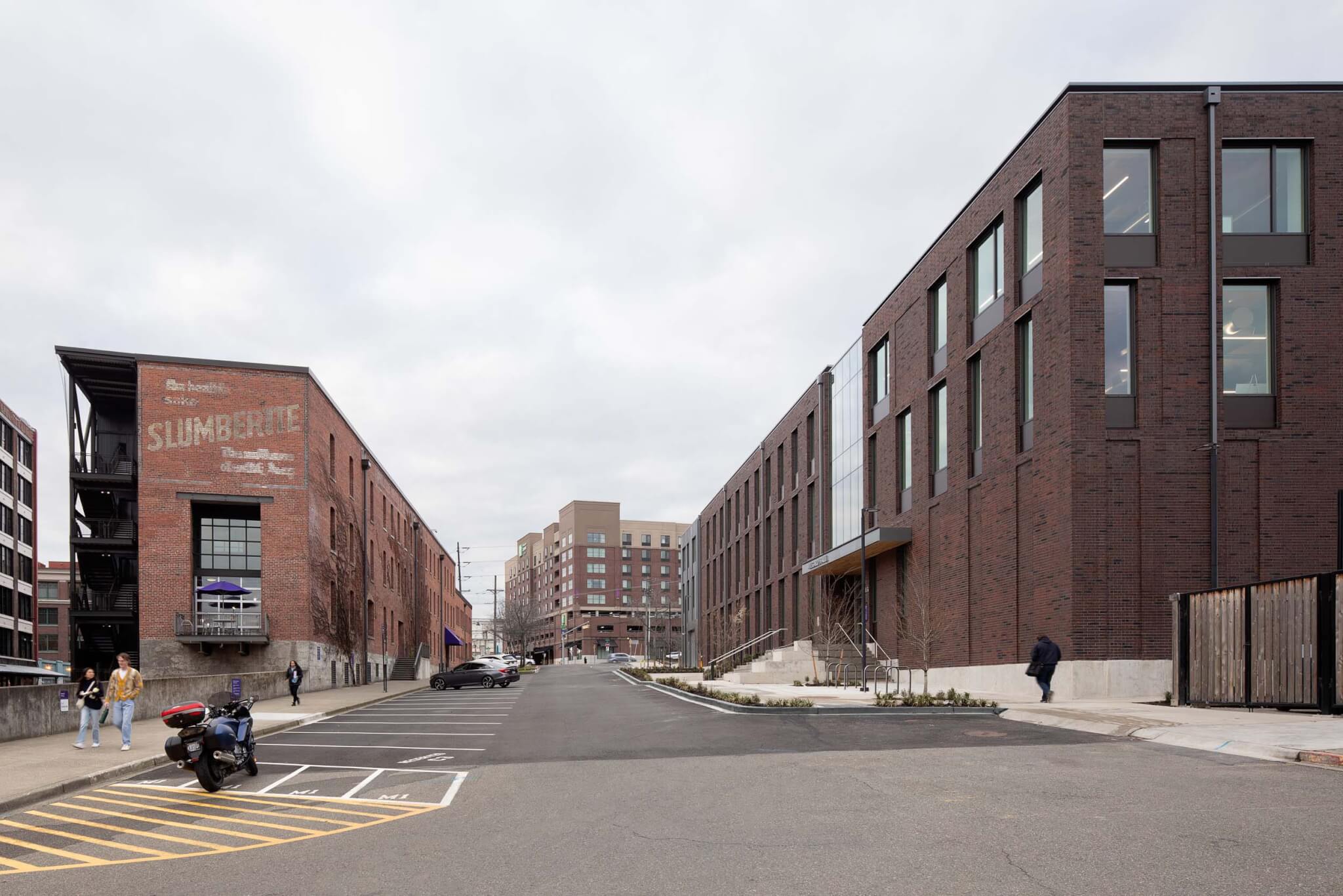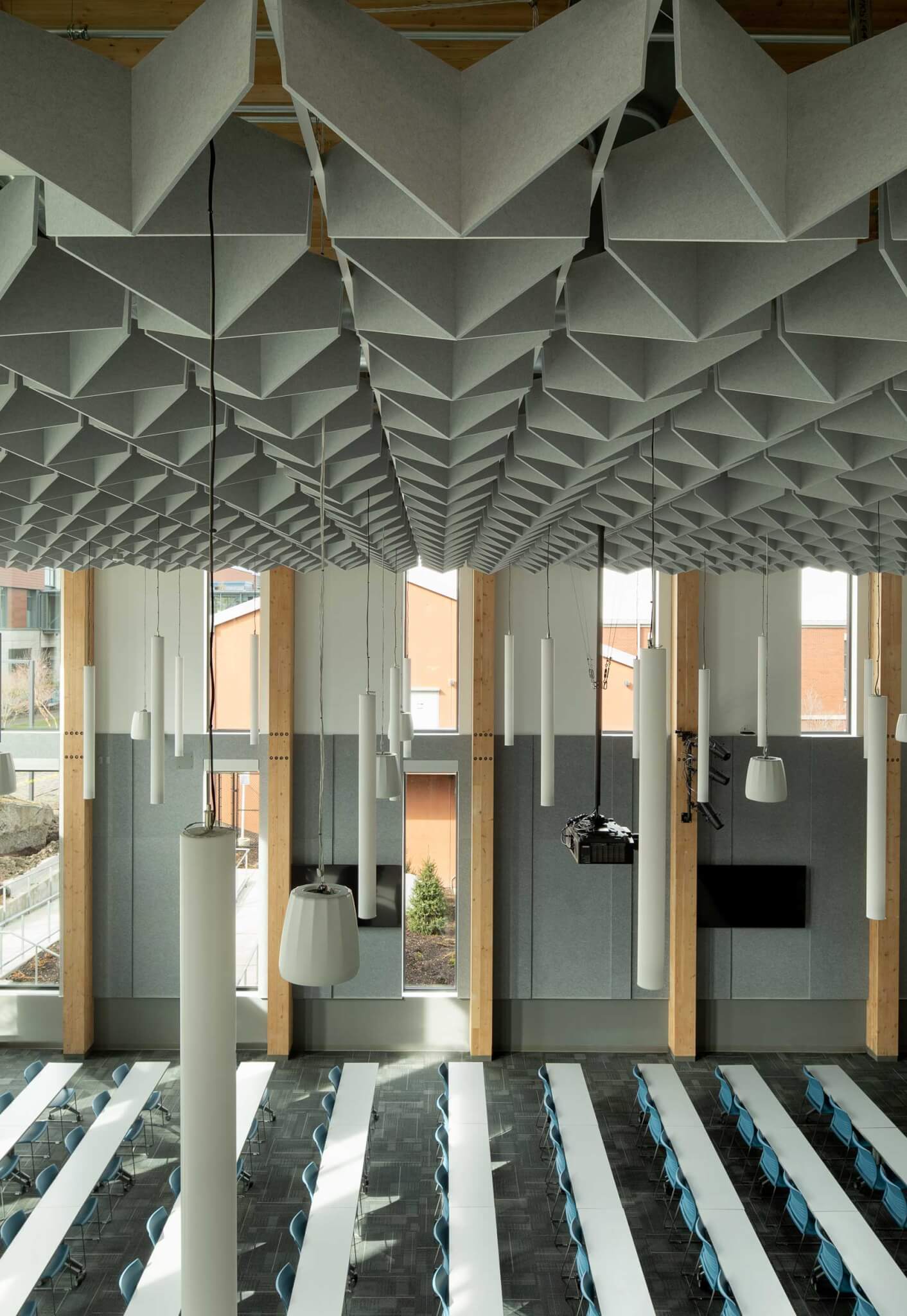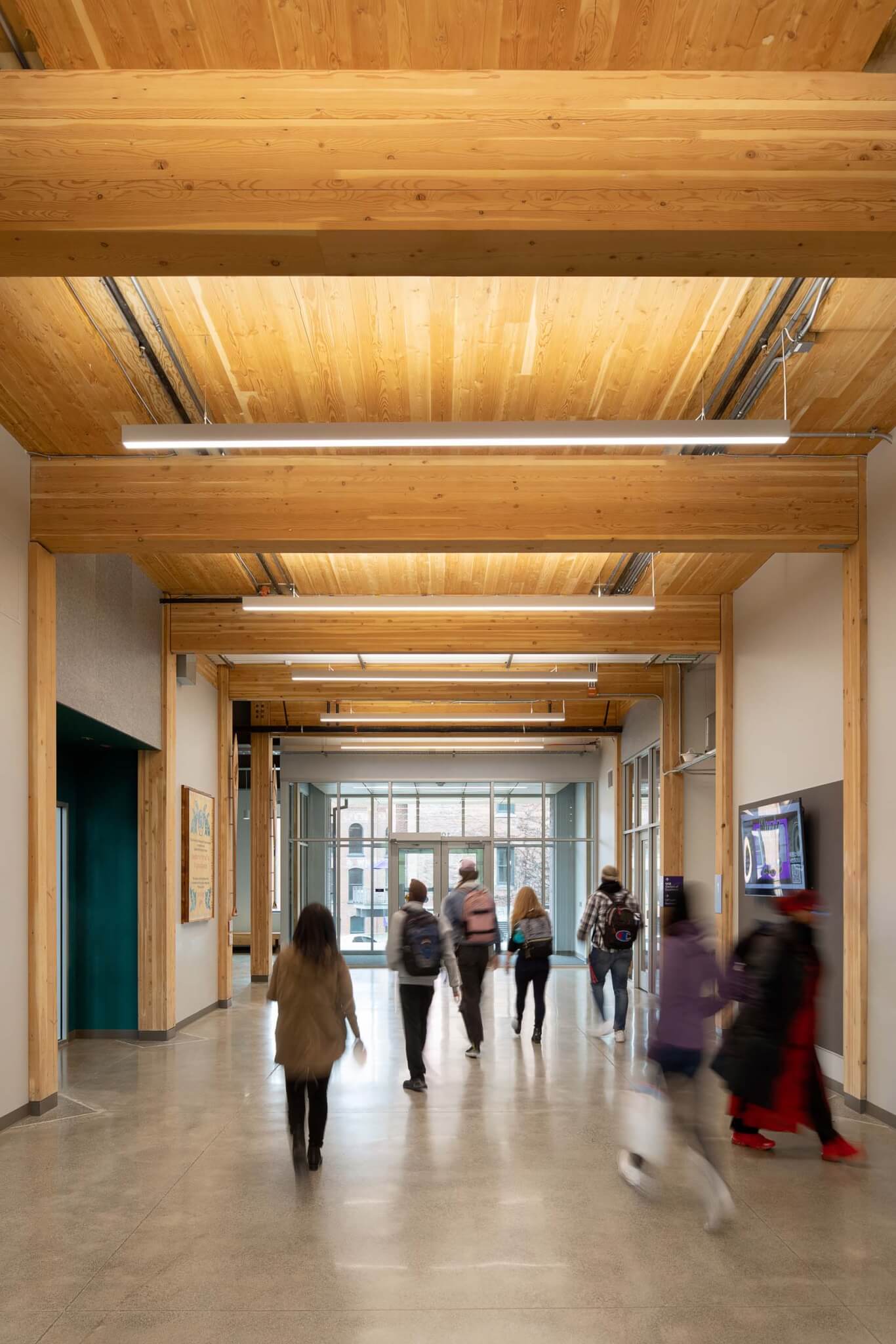 تعمل محكمة العلوم الخارجية كمساحة تنظيم مركزية. إنه يشجع التنشئة الاجتماعية بين المختبرات والفصول الدراسية وورش العمل، ويربط الطلاب بالمساحات المتخصصة مثل مختبرات الاحتراق، ومتجر تصنيع، ومساحة تدريب عالية التأثير مع مساحات مرنة مزدوجة الارتفاع للفصول الدراسية والأحداث. لكن التصميم الداخلي للمبنى هو نجم العرض، حيث يتميز بالأخشاب الضخمة التي تضفي الدفء الطبيعي في جميع أنحاء المبنى. كان استخدام الخشب “أولوية تصميمية مركزية” لشركة ARO، وفقًا لوصف المشروع. إنها قصيدة لارتباط المدينة التاريخي بتجارة الأخشاب وجهد نشط لإنشاء تصميم سياقي مستدام.