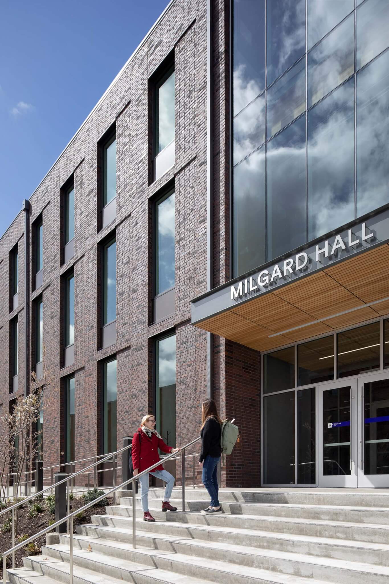 استخدم فريق تصميم وبناء Milgard Hall الطوب في الواجهات الشمالية والشرقية للمبنى لتتناسب مع جيران المبنى، في حين أن الأجنحة الجنوبية والغربية مكسوة بألواح معدنية. يضم الجناح التقليدي المبني من الطوب قاعات دراسية ومكاتب أعضاء هيئة التدريس، ويخلق تجاورًا مثيرًا للاهتمام مع الغلاف المعدني الموجود في الجناح الجنوبي الذي يضم مساحات للمختبرات. يمكن رؤيتها بعد ذلك من طريق Prairie Line Trail في تاكوما، مما يعرض المنحة الدراسية. يندمج كلا الخيارين المعماريين المتعمدين لإنشاء مساحة تعكس رؤية UWT لتصبح حاضنة للتعاون متعدد التخصصات.