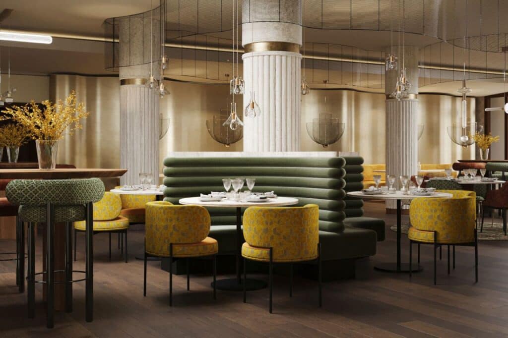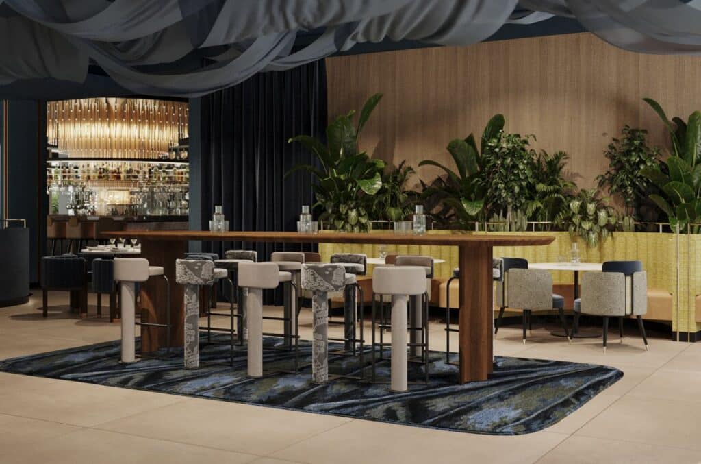 يعكس محور “مسارات الحدائق والسكينة” هدوء الطبيعة – الألوان الزرقاء الباردة، والخضر الباهتة، والرمادي الناعم تستحضر هدوء ممرات الحدائق في الصباح الباكر. بينما يقدم محور “ظلال السحر” أناقة المساء – الأرجواني الغامق، الأسود الحبر، والأخضر الزجاجي مع انعكاسات النحاس لخلق جو مسرحي ومصقول. وأخيرًا، يقدم محور “ما وراء أفق المدينة” الدفء والضيافة من خلال المواد الطبيعية، والألوان الباستيلية مثل البيج والأوكر، والقوام الخشبي الذي يحيط بالضيوف بإحساس من الراحة المنزلية. وكان الهدف الأساسي تصميم سلسلة من المساحات التي تحفز الحواس وتدعوا لاكتشاف طبقات القصة المتتالية.