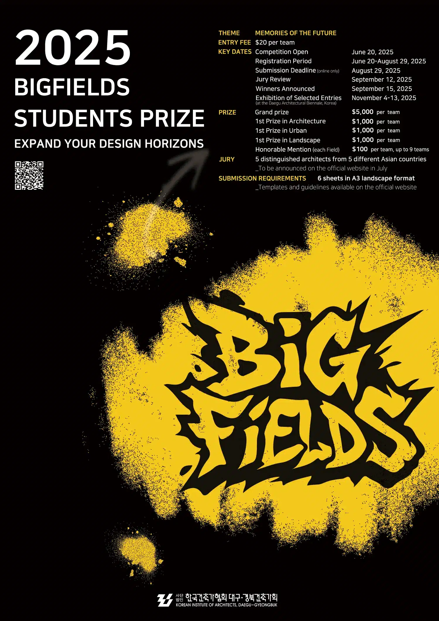 تدعو جائزة Bigfields للطلاب الطلاب من جميع أنحاء آسيا لطرح أسئلة عميقة حول مستقبل العمارة، المدن، والمناظر الطبيعية. وبدون موقع أو برنامج محدد، يشجع هذا التحدي على التفكير الإبداعي والجريء تحت عنوان “ذكريات المستقبل”، حيث يُطلب من المشاركين تصميم مساحات ليست للماضي أو الحاضر، بل لتلك اللحظات والأماكن التي تستحق أن تُتذكر في السنوات القادمة.