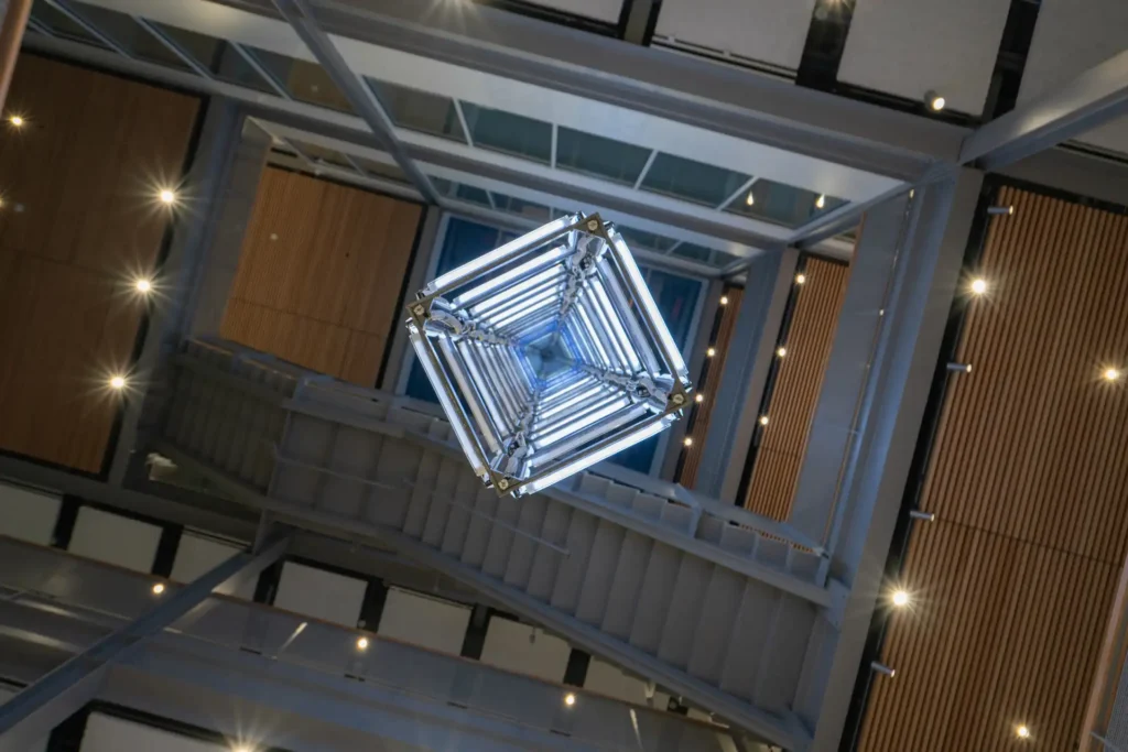 بلمساتها الصناعية من لوحات الدوائر المكشوفة إلى الألومنيوم المشغول بالCNC تتبنى “بنية البيانات” جمالية الشفافية كرد على أزمات الخصوصية والتضليل الرقمي. في الليل، يتحول العمل إلى منارة ضوئية مرئية من خارج المبنى، تربط بين حرم الجامعة التاريخي ومنطقة “ممر آيفي” الناشئة، رمزًا للتواصل بين الماضي والمستقبل.