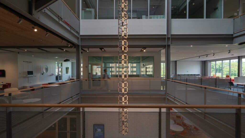 في كتابه الرائد النظرية والتصميم في عصر الجهاز الأول (1960)، تنبأ الناقد رينر بانهام بفجوة بين التقدم التكنولوجي وقدرة المصممين على التعبير عنها. اليوم، مع تدفق البيانات من الأجهزة الذكية إلى البنى التحتية الحضرية، تتسع هذه الفجوة لتصبح تحديًا جماليًا وتواصليًا. كيف يمكن للتصميم أن يعكس هذا السيل اللامرئي من المعلومات؟ هذا هو السؤال الذي يحاول تركيب “بنية البيانات” من استوديو SOSO الإجابة عليه في مبنى مدرسة علوم البيانات بجامعة فرجينيا.