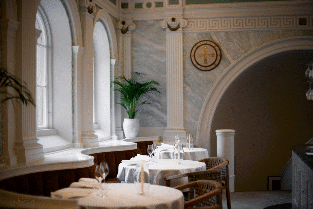 أما مطعم Matsalen، فيقع في كنيسة سابقة في الطابق الأول، ويحتفظ بعناصر أصلية مثل الأسقف المقببة، والدعائم الأيونية، والملائكة المذهّبة، والجدران المزخرفة يدويًا — وكلها تعكس قدسية هادئة وفخامة أصيلة.