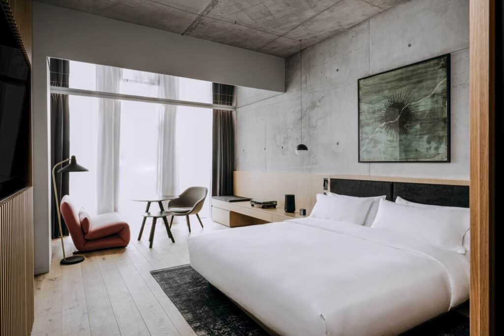 تعمل دواخل الغرف الـ116 من خلال تناقض متعمّد بين الخرسانة الخام والخشب الناعم والتراورتين إلى جانب عناصر مُستلهَمة من Art Deco. هذه اللغة المادية باتت مستخدمة على نطاق واسع في تصميم الضيافة الفاخر على مدى العقد الماضي وتظهر هنا بكفاءة دون تميّز خاص. السلّم النحتي في الردهة الرئيسية مُستشهَد به من المعماريين أنفسهم بوصفه عنصراً فراغياً محورياً، مما يُشير إلى أن الحركة الرأسية صُمِّمت بوصفها مركزاً تجريبياً لا رابطاً وظيفياً.