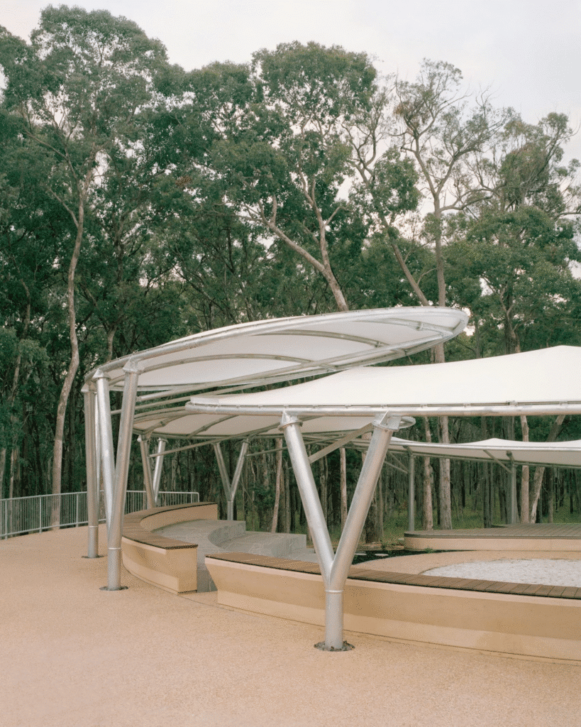 العنصر البصري الأبرز في المشروع هو المظلات المصنوعة من الهياكل الفولاذية المغطاة بالقماش. تمثل هذه المظلات دروع عشائر Gunaikurnai، وتُظلل المنطقة البيضاوية فوق المقاعد، بينما تغطي مظلة أكبر على شكل بوميرانغ منطقة الأداء.