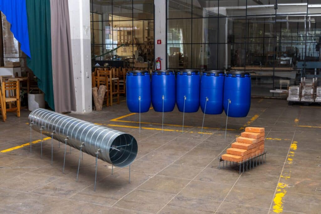 على المستوى نفسه، قدم استوديو Fail طاولة طويلة صُنعت من مواد معثور عليها مدعومة بعناصر مأخوذة من أرفف كتب، بينما رفع استوديو Bangkok Tokyo البراميل والأنابيب والطوب على أرجل معدنية رفيعة، في إشارة إلى أسلوب ياباني في تقديم الطعام يعتمد على رفع العناصر وإبرازها بصريًا. كما عُرض مأوى مؤقت من تصميم TodoEverything Estudio مصنوع من قماش وأشرطة شد، إلى جانب نماذج مصغرة لمبانٍ محلية قدمها استوديو Bessire Winter.