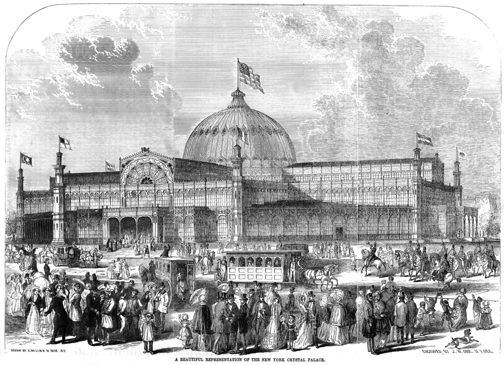 نقش لقصر كريستال نيويورك نُشر عام 1853. يقع قصر كريستال في ما يعرف اليوم بحديقة براينت، وكان موقعًا لمعرض صناعة كل الأمم. هنا، تم عرض أول مصعد حديث من قبل إليشا أوتيس. S. Wallin وW. Wade، الفنانين؛ جي دبليو أور، نقاش، عبر ويكيميديا كومنز