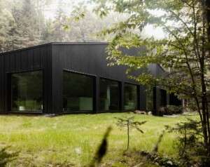 يغطي الجزء الخارجي الأسود لهذا المنزل في الغابة مساحة داخلية بيضاء بسيطة