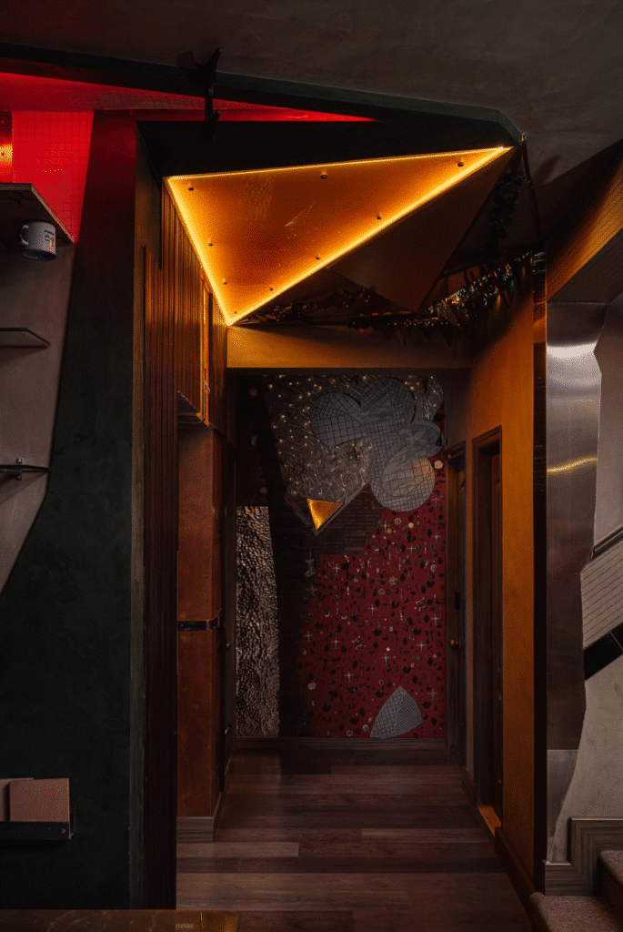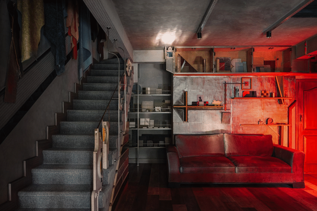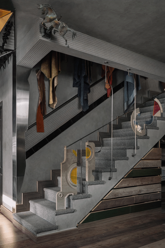 يحتوي الدرج، المؤدي إلى مساحة غير مفروشة مخصصة للتوسع المستقبلي، على درابزين نحتية مصنوعة من قطع الأكريليك مرتبة بأشكال هندسية. يحتوي الممر الذي يربط الصالة ومنطقة الاختيار وغرف الاجتماعات على تركيب معلق من لوحات أكريليك مضاءة وصناديق كهربائية مهملة. في نهاية الممر، تشكل قطع معدنية ومواد بناء فائضة شجرة بأسلوب ستيمبانك، مع نموذج MDF من مشروع سابق كقمة للشجرة.