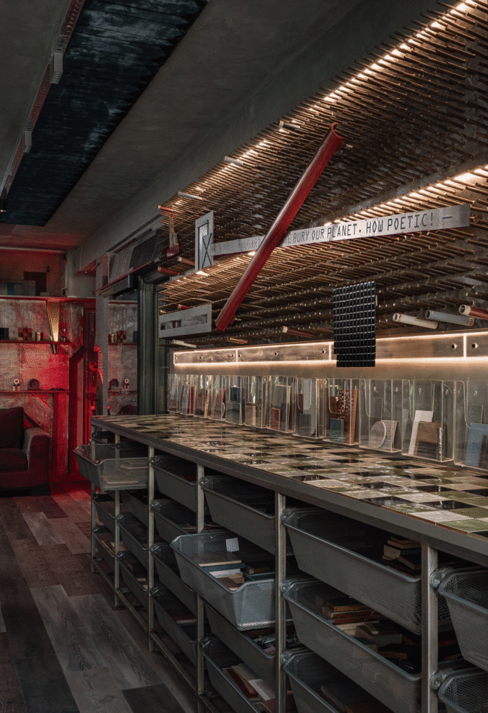 يجسد Requiem for Ruins من Multitude of Sins نهجًا مبتكرًا يحتفي بالنفايات كمورد. كل عنصر تقريبًا، من الطاولة المركزية إلى التركيبات السقفية، مصنوع من مواد مهملة أو فائضة، موضحًا كيف يمكن للتجريب والاستدامة أن تتعايش بسلاسة. يعمل المختبر كمركز بحثي للمواد وسرد مكاني متطور يعكس فلسفة الاستوديو.