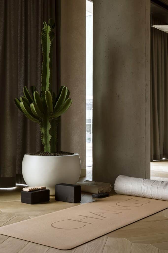 يشغل المشروع مساحة تقارب 900 متر مربع، ويُنظم عبر مجموعة من المناطق المرتبطة التي تستوعب أنشطة مختلفة مثل اليوغا والبيلاتس والتدريب الوظيفي، إضافة إلى مساحات الاستشفاء. لا تعتمد هذه المناطق على فصل صارم، بل على انتقالات تدريجية تسمح بالتحول السلس بين النشاط والراحة.
