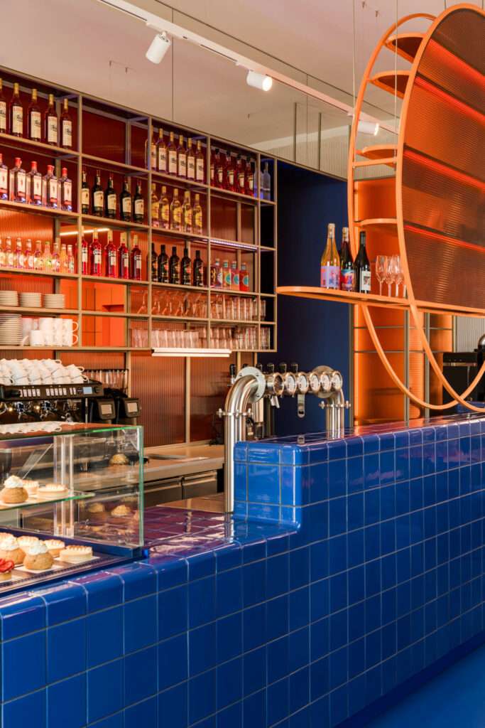 For a peek at the daily pastry production, an open concept kitchen gives customers a glimpse at the baking equipment and steel elements. Bright cobalt blue is woven throughout the space, referencing the owners’ first restaurant, which was also designed by Znamy Się, and its connection to flour sacks with blue stripes. The other primary color, orange, changes the tone to ready for a night out, and is also seen in the glass wheel. Thus, Pastry Club Woda’s clever combination of pastry shop by day and nightclub by night honors its historic roots, and its modern-day, multi-purpose appeal.