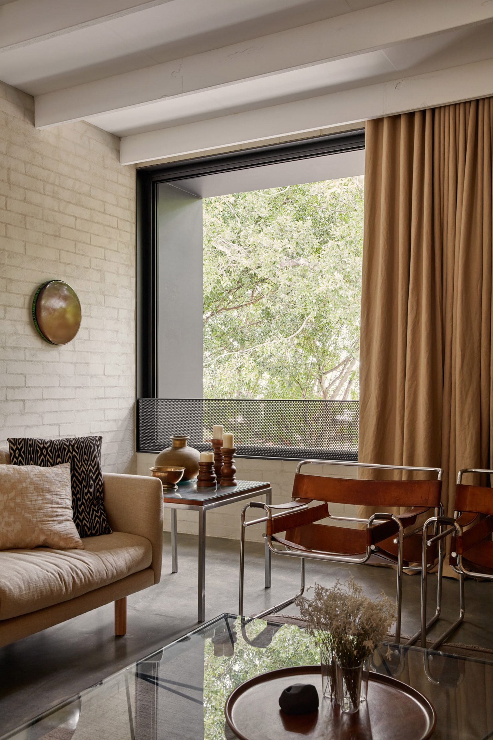 A distinctive feature of The Brick House is its flipped floor plan, with bedrooms located on the ground floor and communal areas above. This design maximizes natural light penetration on the narrow site while optimizing functional space allocation.