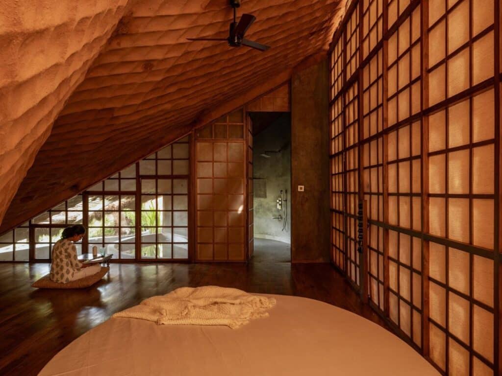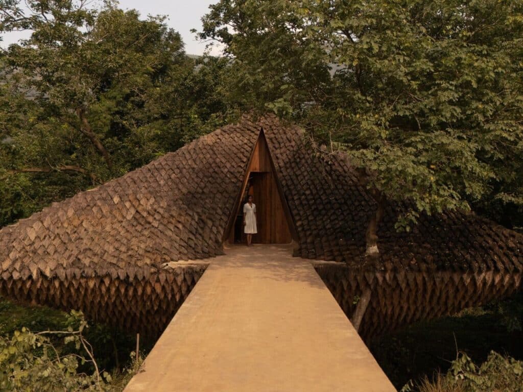 The exterior surface features layered straw arranged in overlapping patterns, inspired by the skin of the pangolin, allowing it to blend seamlessly with the dense forest canopy. This envelope not only provides visual beauty but also serves a functional role in thermal insulation, keeping the interior cool under Kargat’s humid climate and fluctuating monsoon winds.
