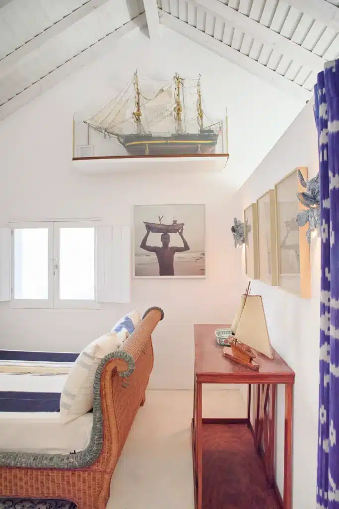 The villa’s overall ambiance is simple and maritime in character, with lamps adorned with clusters of seashells, miniature boats decorating the walls, and a color rhythm flowing between white, deep blue, and warm sunlit terracotta tones.