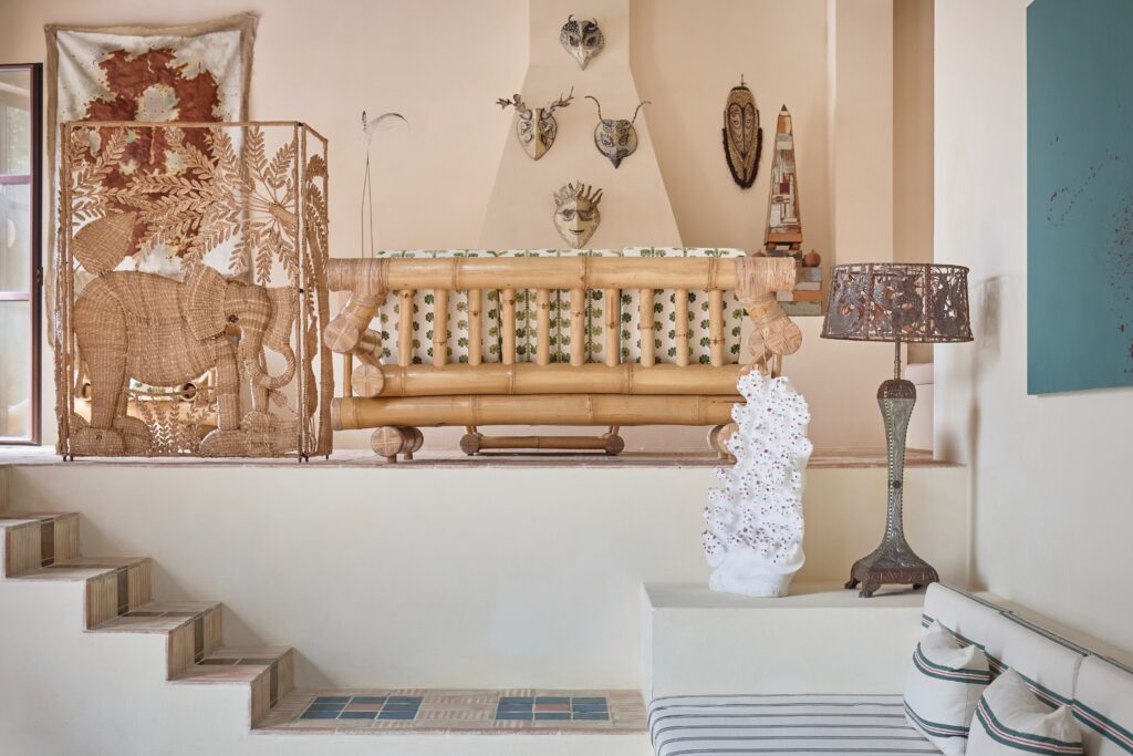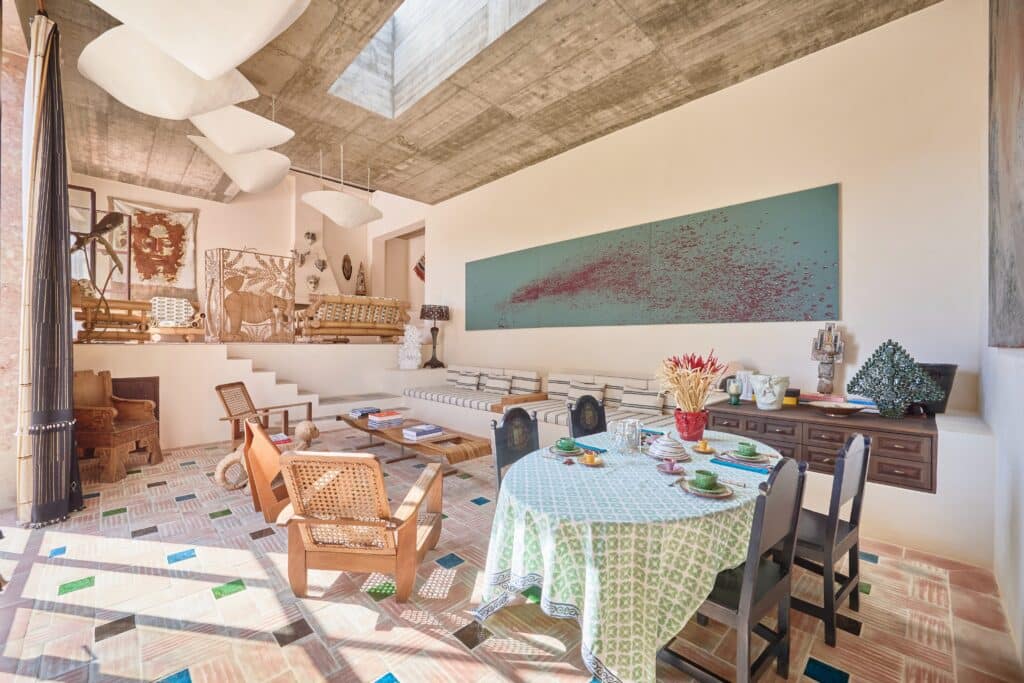 Inside the villa, a warm sandy color palette prevails, accented with touches of red and indigo. These colors appear in details such as built-in seating upholstered in fabrics adorned with quatrefoil motifs, or in textile artworks by artist Jean-Louis Viaud. The living room features a glass ceiling that allows natural light to flood in, while antiques are incorporated under high ceilings to create a sense of spaciousness.