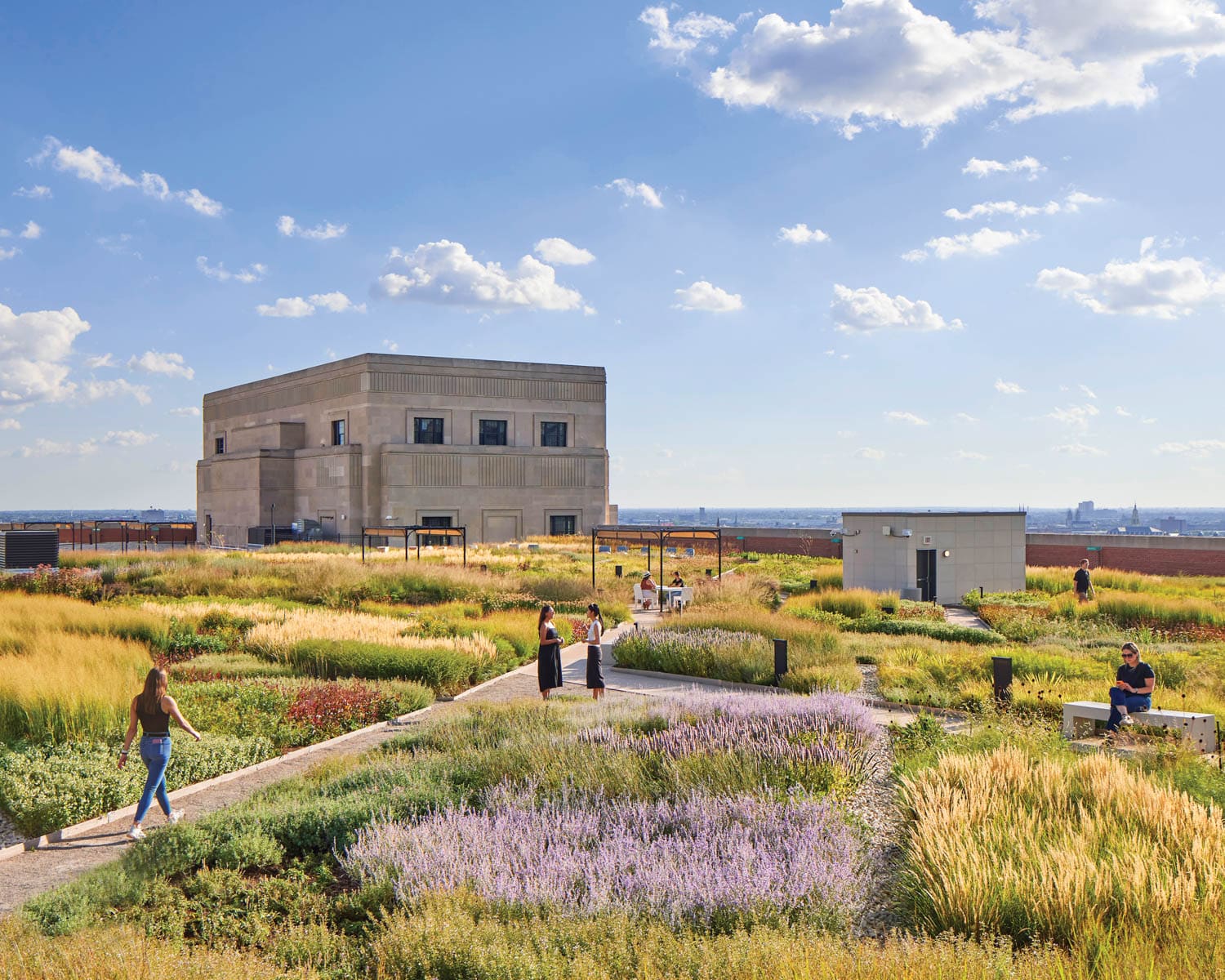 Hoerr Schaudt’s design ingeniously integrates footpaths around major structural beams, maximizing the roof’s load-bearing capacity. Elsewhere, a tapestry of perennials and grasses, planted in a custom ultra-lightweight soil mix, blankets the rooftop. This verdant oasis not only enhances the building’s aesthetic allure but also aligns with sustainability objectives, making it one of the nation’s largest private green roofs.