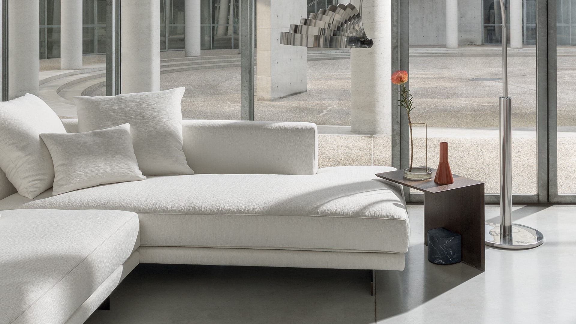 The walnut wood base gives the design structural integrity, with intersecting legs creating an elegant ‘X’ shape. The folding chair is crafted entirely of wood, with legs forming an ‘X’ shape just like the table, and the ever-changing wood grain patterns give it an organic dimension. Ciàcola marks the exceptional combination between the genius design and the culture shared by Tobia Scarpa and the Gruppo Euromobil. Both from the Veneto countryside, enacting a tribute to Venetian socialising over the years. The Sheridan sofa is a wonderful alternative in the company’s catalogue, designed by the acclaimed duo Matteo Thun & Antonio Rodriguez. Square lines, wide seats, and an inviting upholstery create a luxurious yet functional living experience.