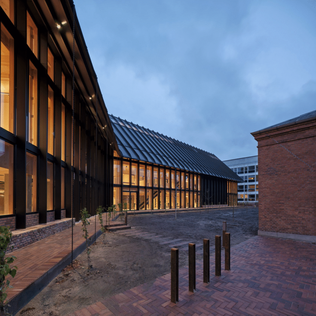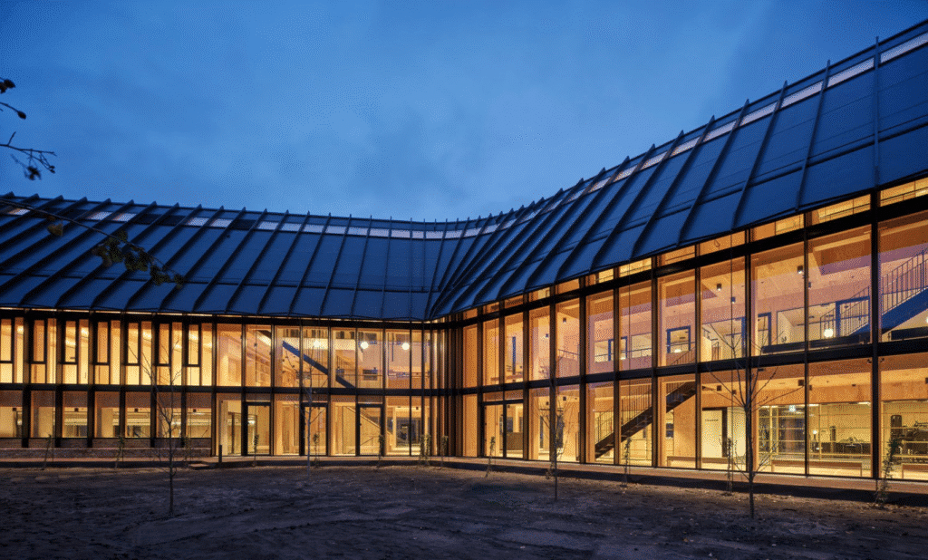 The building features a curved form, clad in soft metal and expansive glass, harmonizing with the surrounding red-brick structures. At the core of the design is the “Heart Room,” an atrium supported by 15-meter-high glulam timber arches that create a cathedral-like atmosphere. This central space connects all major functional areas, including educational spaces, physical training zones, consultation rooms, and the community kitchen.