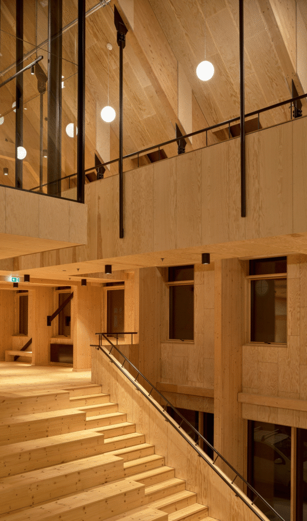 The use of Swedish timber for the interior lining enhances acoustic comfort, provides warmth, and improves indoor air quality. Timber was selected for its aesthetic qualities, environmental performance, and ability to create a tactile and inviting environment. Complementing the timber are soft metals, glass, and neutral finishes, resulting in spaces that feel both modern and human-centered.