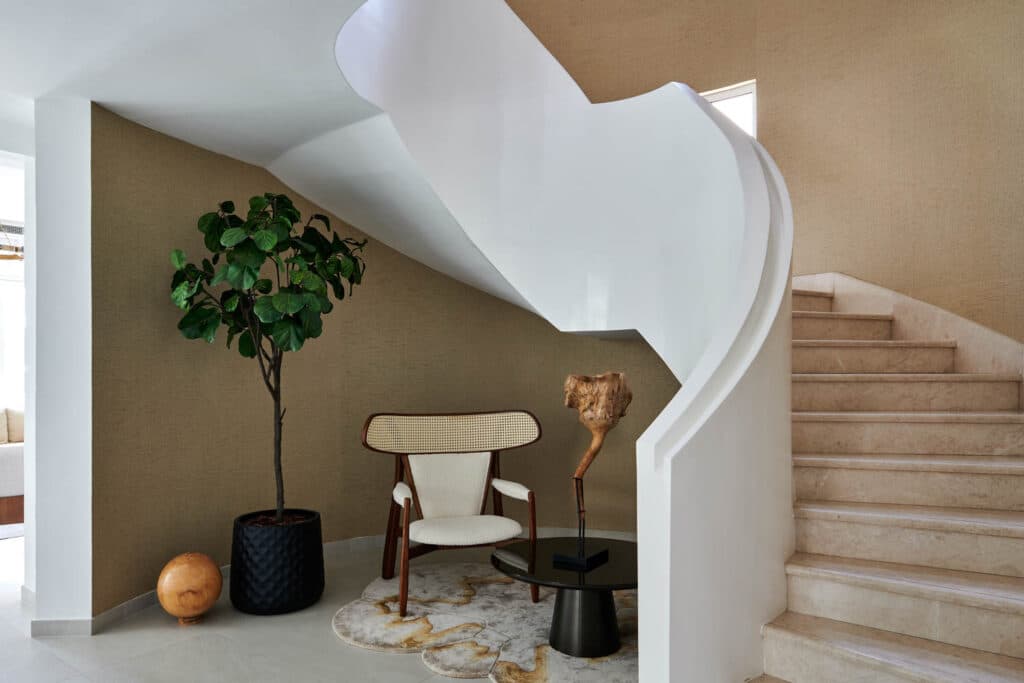 The dining area and living area are skillfully divided by a curtain wall. An exquisite white staircase with a sturdy concrete balustrade leads to the upstairs. He claims that “we approached [the staircase design] as a sculpture,” using a “pure monolithic handrail” made of solid, clean white concrete. The comforting tones of the textured brown wallcovering are echoed by the steps formed by Omani beige marble. More space is created beside the pool with a large pergola.