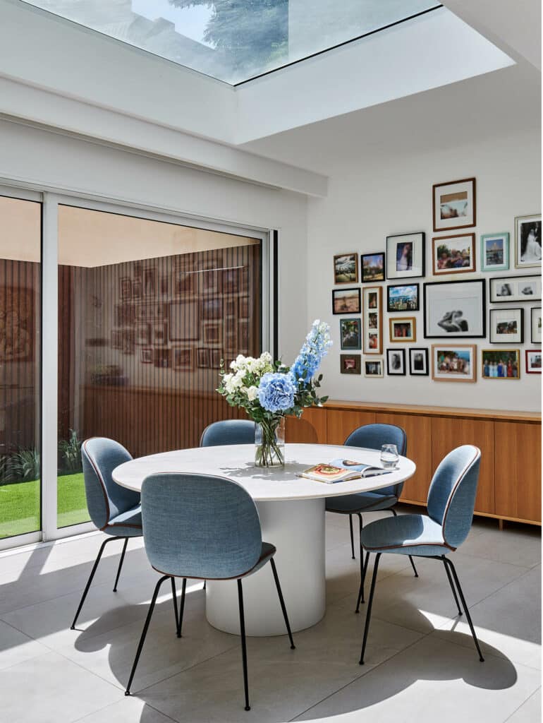 The private dining area is defined by a big step-out window that lets in plenty of natural light thanks to a large skylight, while the main entrance offers views of the garden and lake.