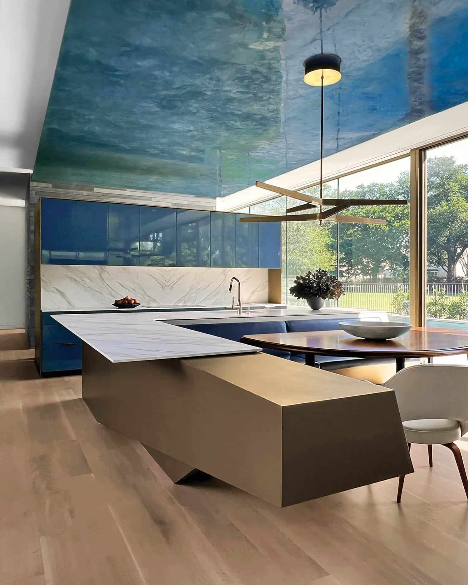 The kitchen, situated adjacent to a serene courtyard, exudes an undersea ambiance with its captivating midnight-blue plaster ceiling. This striking feature sets the tone for the entire space, infusing it with depth and character. The use of rich Carrara marble and sultry brass accents further enhances the kitchen’s allure, creating an atmosphere of refined elegance. Floor-to-ceiling windows not only flood the space with light but also offer panoramic views of the verdant surroundings, blurring the boundaries between indoor and outdoor living. Erin Sander Design