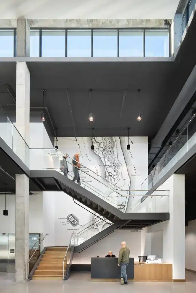 The sleek, elevated structure clad in dark gray fiber cement panels and warm, weathered wood accents stands apart from typical coastal architecture. A south-facing glass curtain wall floods the interior with daylight, welcoming visitors into a lobby lit by a clerestory above an open staircase. The exhibit galleries, arranged around a central orientation area, expand the narrative beyond the 1865 battle. “Archaeological evidence shows Indigenous inhabitants here 9,000 years ago,” Stallings notes. The exhibits now honor these layers of history, including the enslaved laborers who built the original fort.