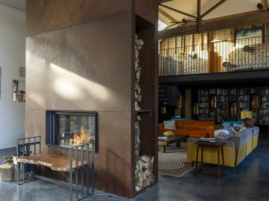 - The Corten steel fireplace, which has become a focal point in the living area.