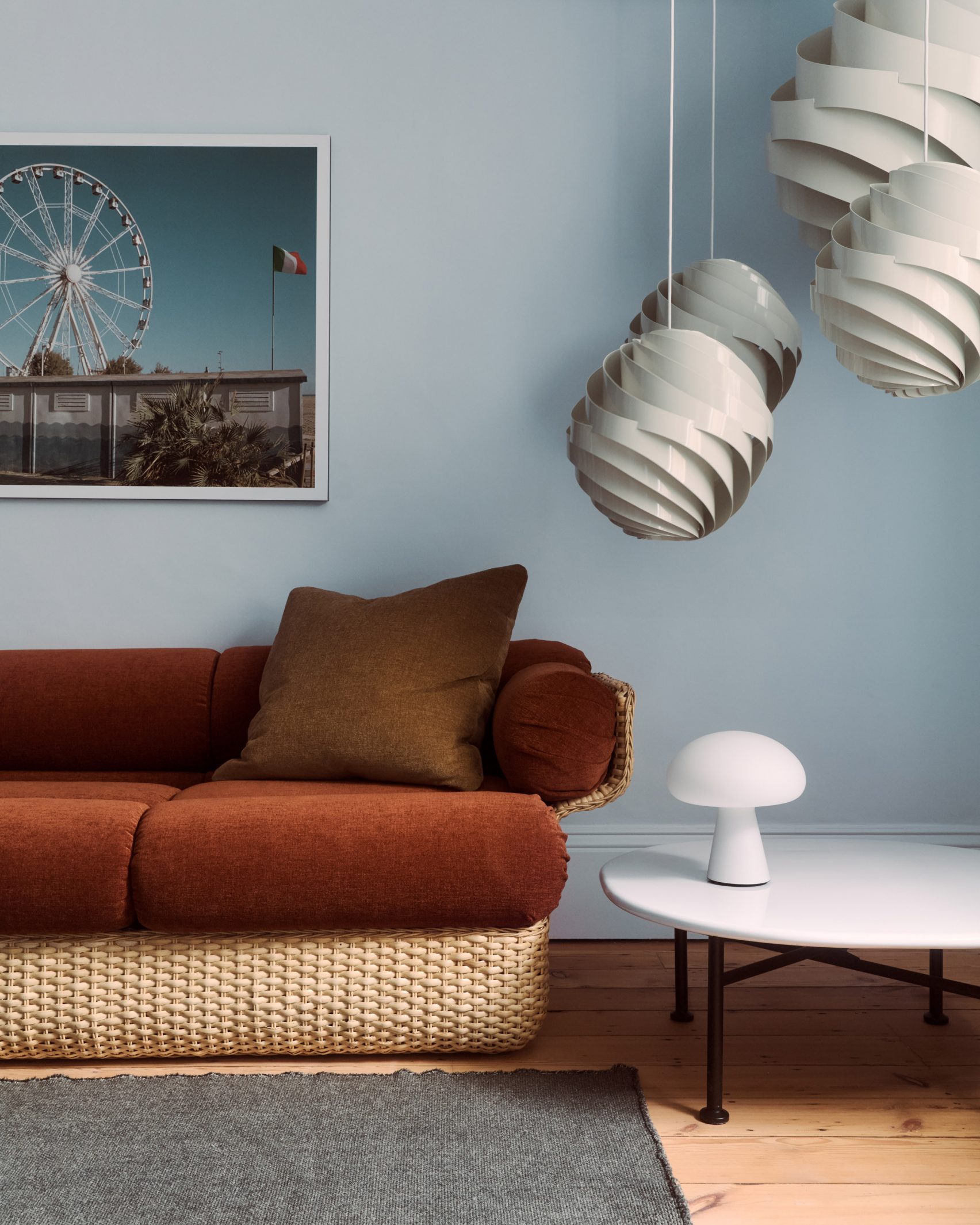 Each of the four floors of Gubi House London is designed to reflect different influences and eras, offering a unique experience and highlighting various aspects of Gubi’s collection. The curated color palettes and materials feature bespoke choices, such as hand-painted forest-green wallpaper, deep inky blue fireplaces, and earthy 1970s-inspired tones. The ground floor, described as “boutique chic,” features spaces that emulate the sense of comfort and luxury of a boutique hotel. Key details include a fireplace color-blocked in a deep inky shade of blue, which serves as a backdrop to the brand’s Moon dining table and Bat dining chairs. Also on display here are several reissued 20th-century lamps, including designs by Finnish designer Paavo Tynell, Danish architect Louis Weisdorf, and Swedish designer Greta M Grossman.