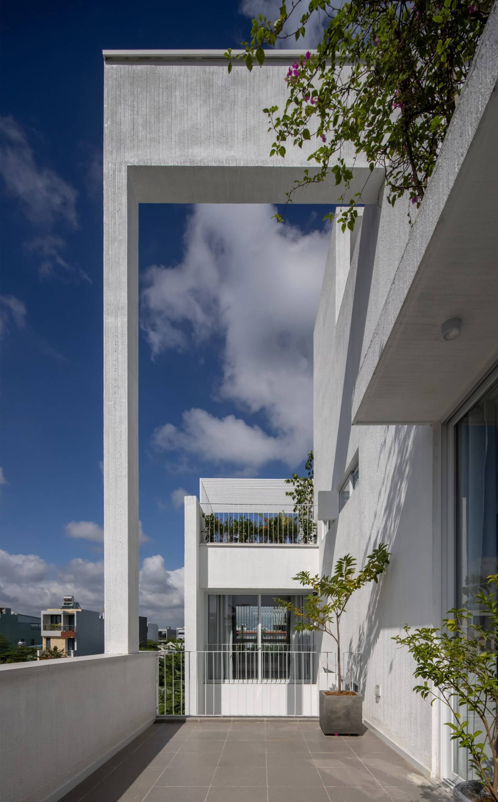 Throughout the House for Young Families by H-H Studio, a textured white coating envelops both the interior and exterior walls, accentuating the geometric, stacked form of the structure. This minimalist aesthetic serves as a backdrop for the vibrant greenery, creating a striking contrast that enhances the visual appeal of the space. The integration of planting areas, terraces, and balconies further blurs the distinction between architecture and nature. Therefore, fostering a symbiotic relationship that celebrates the beauty of the natural world.