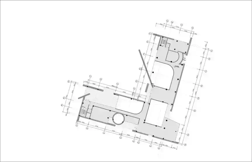 The addition of circular elements further emphasizes the geometrical sense of the building. The curved wall is displayed at the opening of the outer wall, and completely different materials are used to form a visual focus on the facade. The interior is also interspersed with blocks of different shapes, forming a rich and varied space.