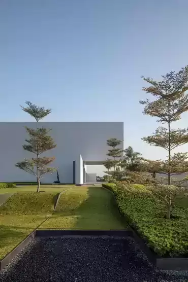 In the choice of facade color, we considered the city of Haikou’s warm and comfortable year-round climate, with sufficient sunshine, and chose white in order to make the building brighter and more refreshing visually. The large area of the white wall is like a pure canvas, with the light and shadow serving as pen and ink. Painting on the wall is reminiscent of traditional Chinese painting.