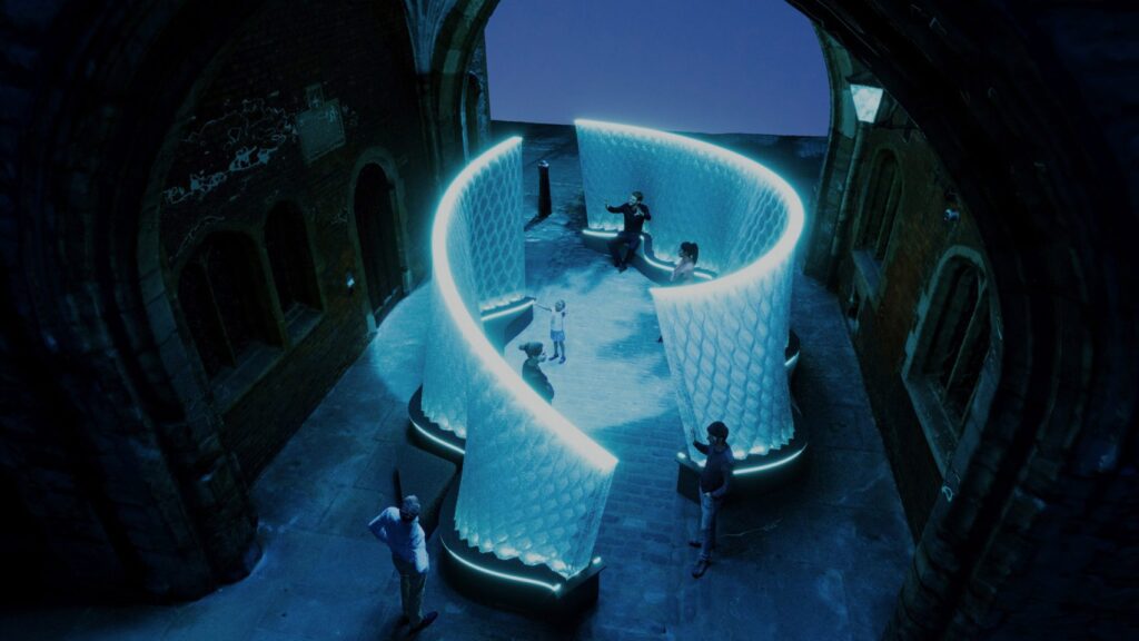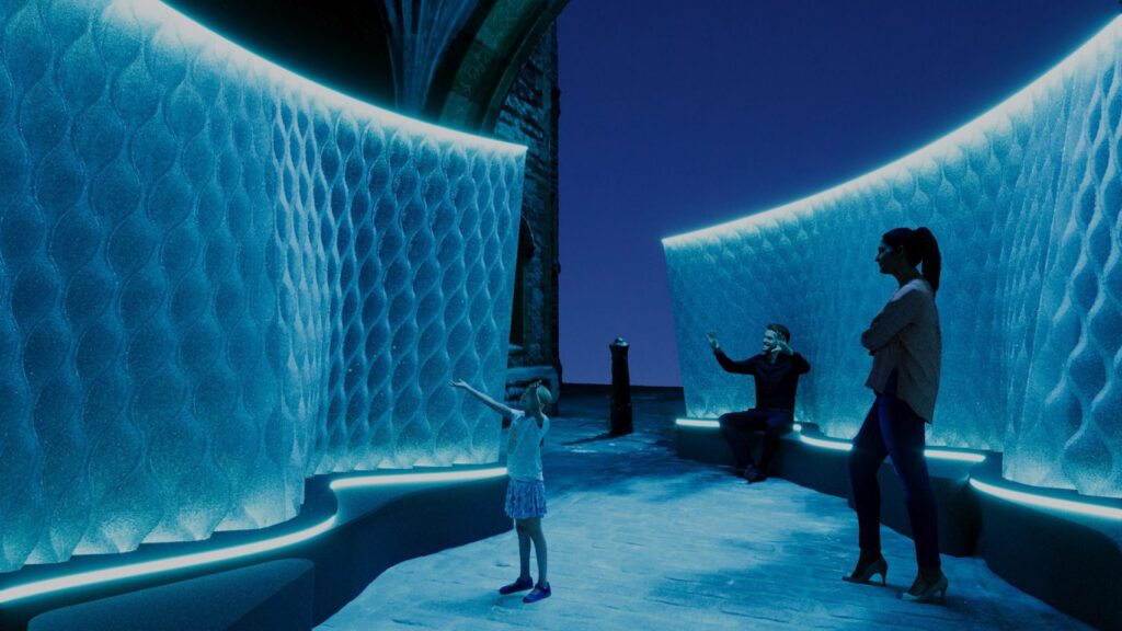 Harmonic Tides is more than a visual experience—it is a multi-sensory installation that combines light, form, and sound to evoke the serenity of underwater environments. Visitors will walk through a glowing “water corridor” enhanced by animated blue LED lights and gentle musical compositions that respond to wave-like rhythms.