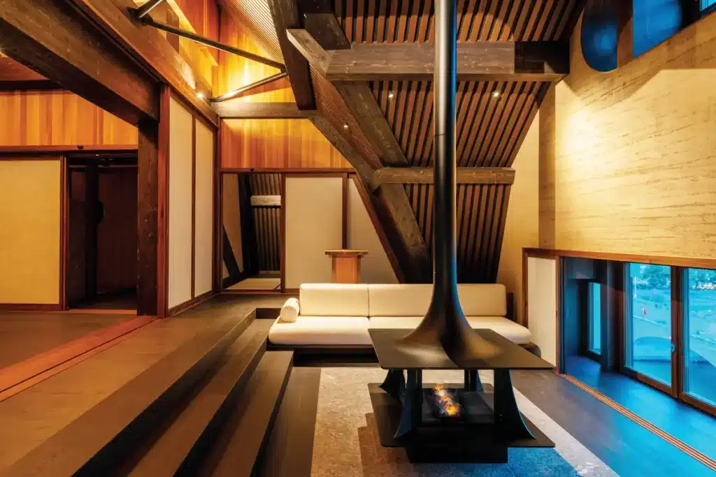 - Spa: Charred cedar panels and compressed clay walls mimic the simplicity of Japanese cuisine.