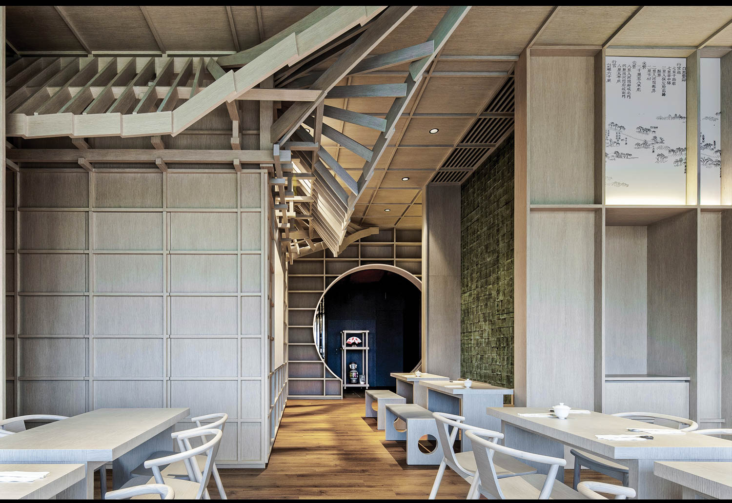 Stepping into Zia, visitors are greeted by a tapestry of cultural artifacts and artistic flourishes. Reproductions of Qing Dynasty scrolls adorn the walls, offering glimpses into the emperor’s storied journeys. Green ceramic tiles, embellished with UV-printed text narrating historical anecdotes, infuse the space with authenticity and depth. The teahouse’s subtle color palette, inspired by mineral tones found in Chinese ink paintings, adds a layer of sophistication to the overall ambiance.