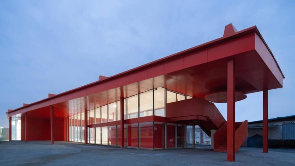 - The two pavilions are clad in vibrant red metal panels, making them stand out in the urban landscape.