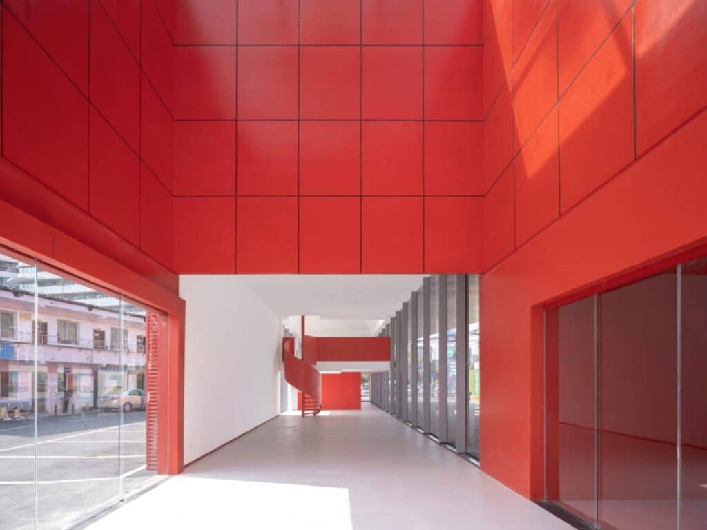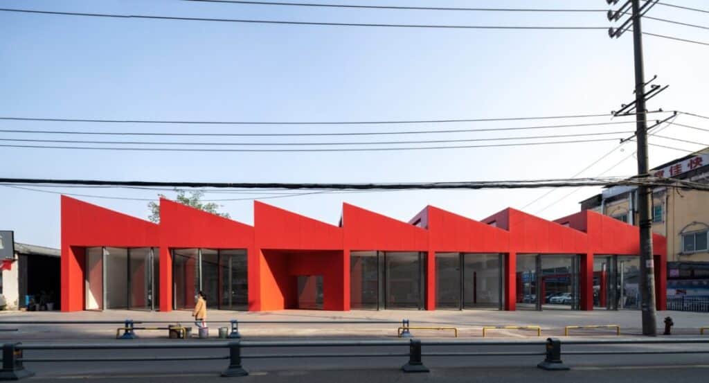 Located at a prominent intersection in Shuangliu District, the showroom’s two red-clad pavilions create a powerful visual identity, reinforcing Hongmeng’s rebranding as a luxury automotive hub in Southwest China. Despite its modest 600 m² footprint, the design maximizes impact through innovative materials, strategic lighting, and dynamic spatial planning.