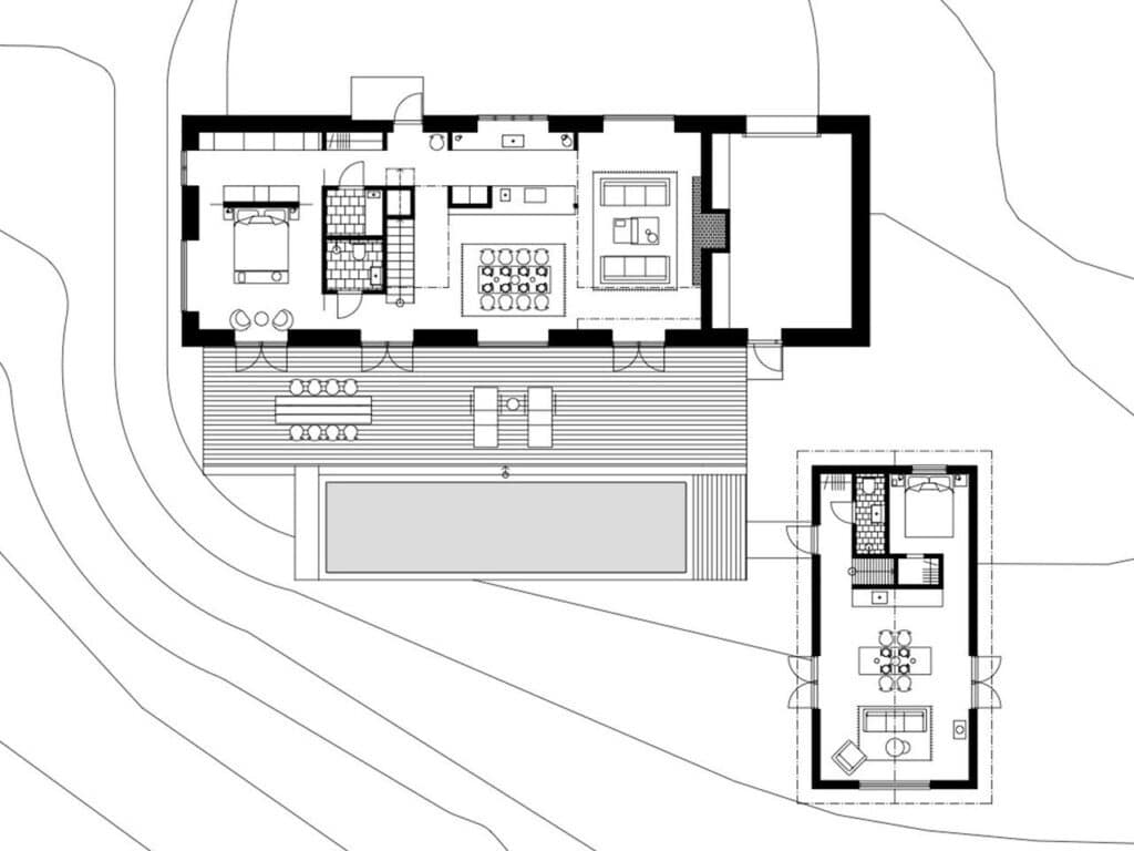 The location of the guest house grants mutual privacy for both structures, while maintaining a visual connection across the meadow.