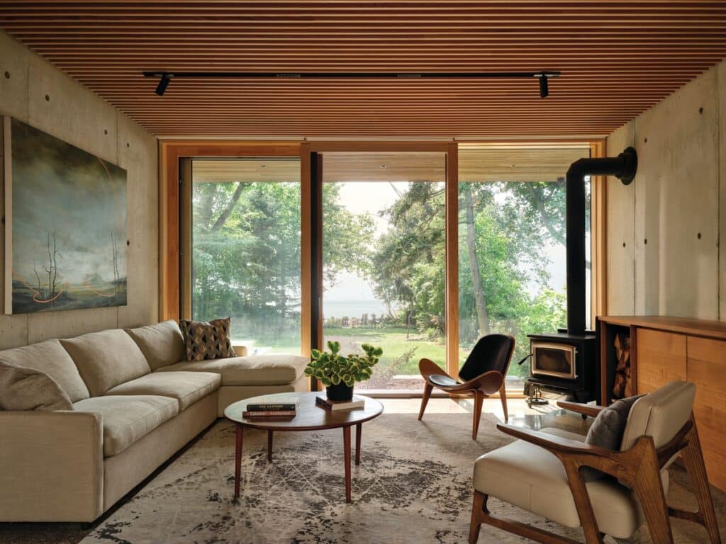 Finally, the screens embody a spirit of gathering and connection. They not only bring light but also define intimate spaces for sitting and connecting throughout the house, from the contractor’s studio connected to an open loft above, to the second-floor balcony that provides an intimate, elevated view of the lake. The “House of Screens” is a testament to the magic of thoughtful architectural design, where meticulous details – like windows disappearing into columns and smooth wall transitions – create a harmonious experience that allows the homeowners to focus on what truly matters: art, conversation, or simply watching the waves shimmer in the sunlight.